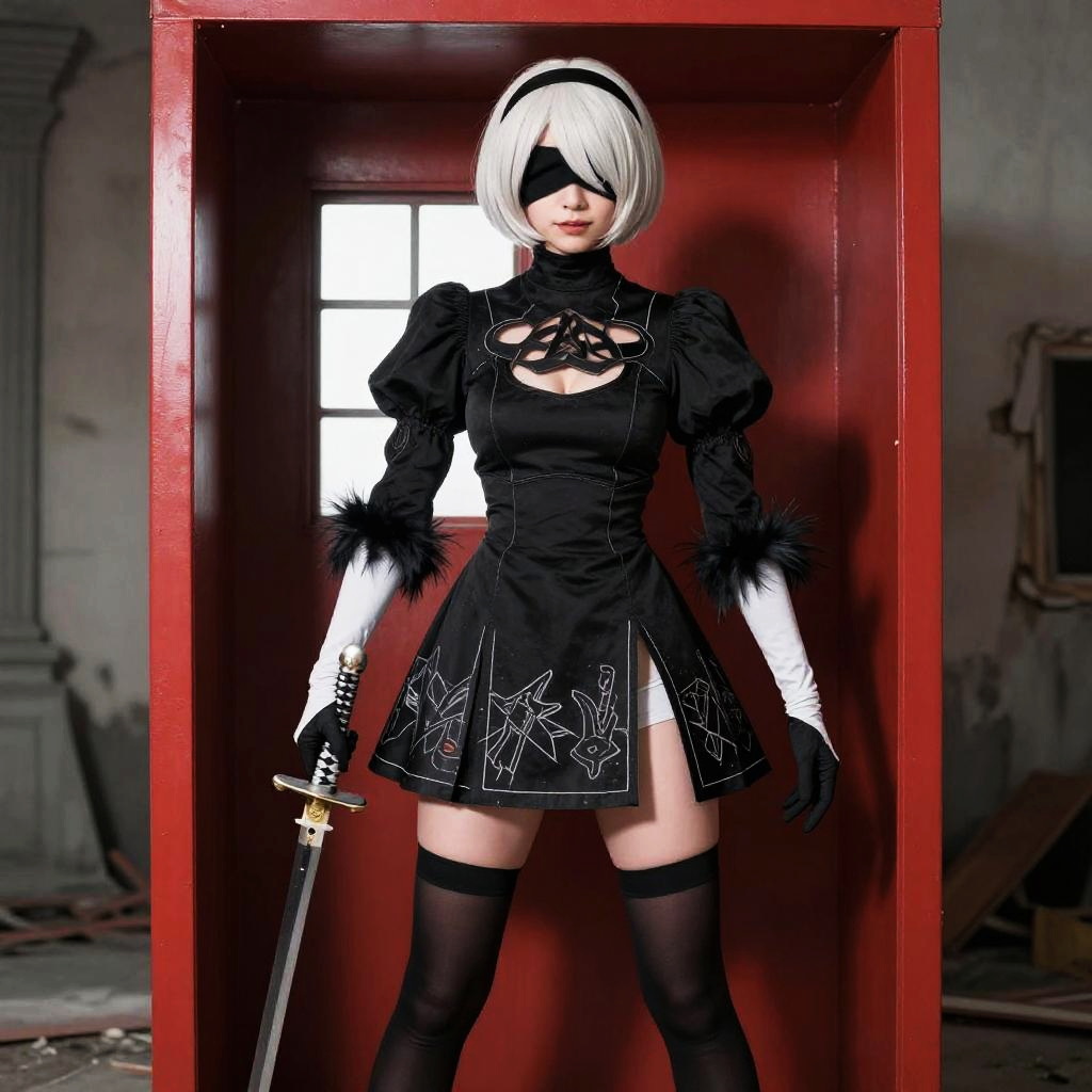 Inbox\(ttp\), (8k, RAW photo, best quality, masterpiece:1.2), (realistic, photo-realistic:1.37), full body, ((in a toy box with window)), red box, ruins for backgroundtall girl, 2B Nier Automata, yorha no. 2 type b, solo, bob cut, blue eyes, (white hair:1.3), parted lips, lips, smile, breasts, mole under mouth, medium breasts, juliet sleeves, puffy sleeves, cleavage cutout, black hairband, black thighhighs, white gloves, turtleneck, bangs, feather trim, feather-trimmed sleeves, covered navel, long legs, (pod drone), (katana sword:1.2), (black blindfold:2), (side split skirt, black skirt :1.2), white high cut underwear