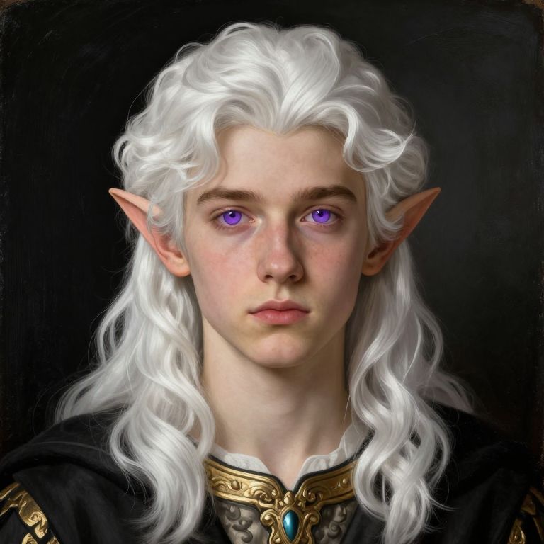 A digital painting of a young, androgynous elf with fair skin and striking purple eyes. They have long, wavy, white hair and pointed ears. They wear a black, ornate robe with gold accents and a turquoise gem at the neckline. The background is a solid black, which highlights the elf's pale complexion and vivid eyes. The style is highly detailed and realistic, with a focus on the elf's ethereal and magical appearance. The lighting emphasizes the texture of the hair and the smoothness of their skin.
