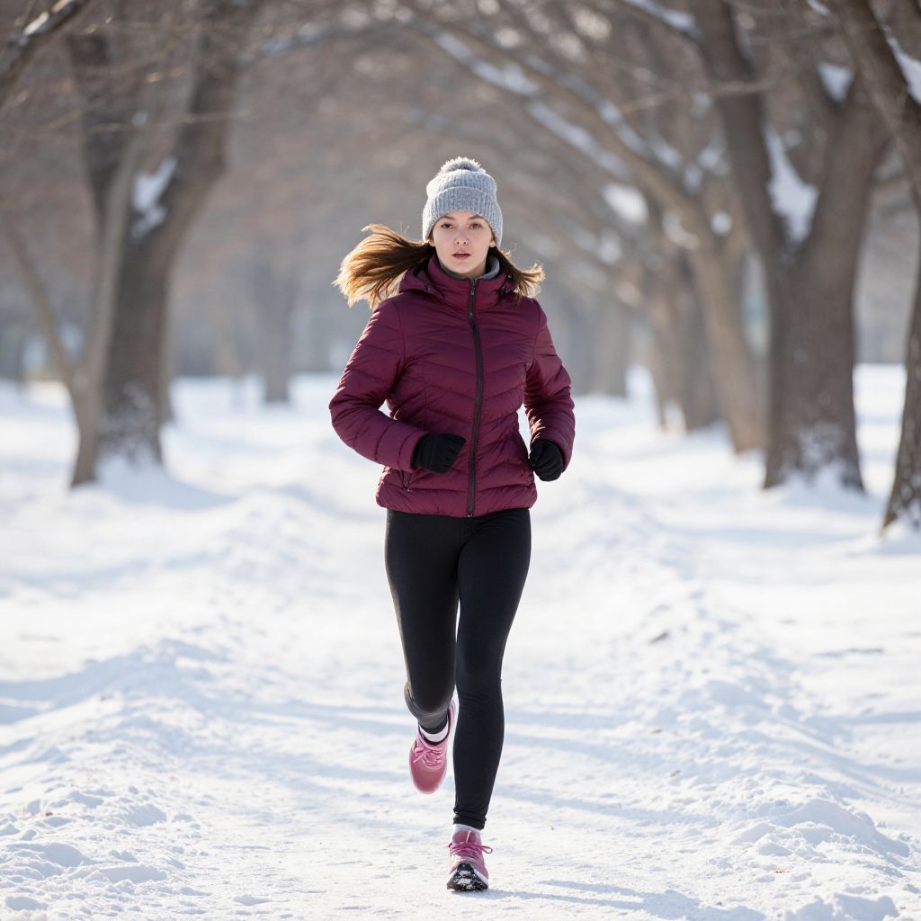Energetic young woman jogging along a snow-covered trail in a winter park, wearing a maroon puffer jacket, black leggings, pink sneakers, and a gray knit hat, with trees and sunlight softly blurred in the background.
