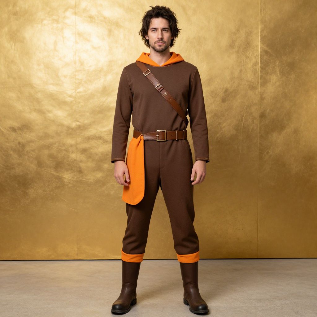 Photograph of a man with curly black hair and a beard, standing against a textured, golden background. He wears a brown medieval-style jumpsuit with an orange hood, orange trim on the cuffs and hem, and a brown leather belt with a strap crossing his chest. An orange sash is draped over his right hip. Black boots complete the outfit. The man's expression is neutral, and he stands with his arms relaxed by his sides. The lighting is even, highlighting the earthy tones of his costume.