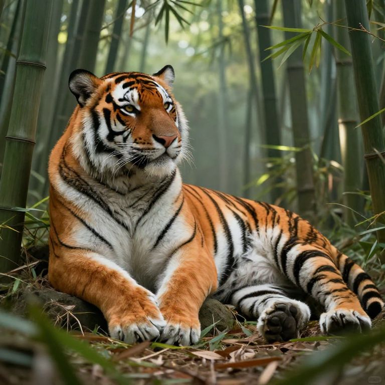 Photograph of a large Bengal tiger lying in a dense bamboo forest. The tiger's vibrant orange coat with black stripes and white underbelly contrasts with the green bamboo and brown forest floor. Its piercing yellow eyes gaze to the left, and it has a muscular build with large paws resting in front. The background is filled with tall, slender bamboo stalks and dappled sunlight filtering through the foliage, creating a serene and natural setting. The tiger's fur appears smooth and well-groomed, highlighting its majestic presence in its natural habitat.