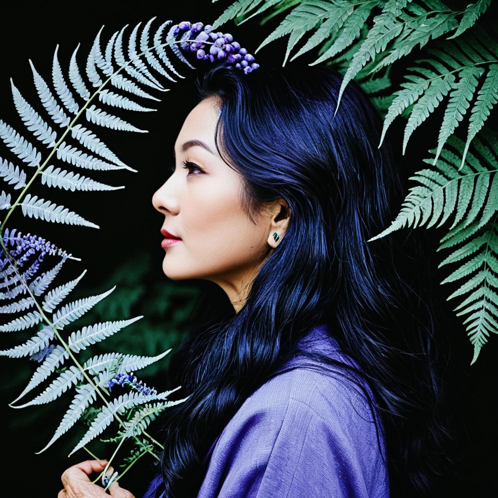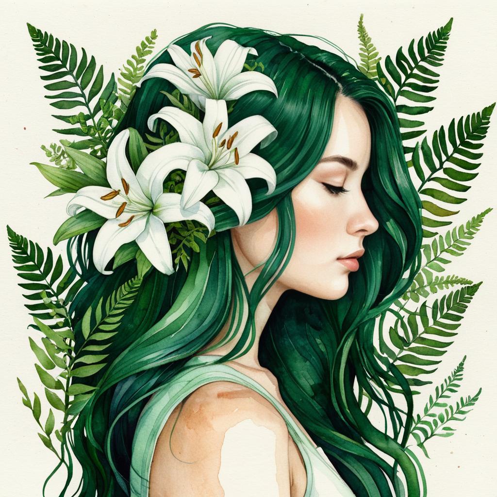 A stylized profile of middle-aged man with flowing silver blue hair intertwined with vibrant magnolia blossoms and ivy leaves. Her serene expression is complemented by botanical elements growing across her shoulders and upper body. The color palette features silver blue, white, and forest green, creating a harmonious and captivating composition. The background is textured, emphasizing the artistic integration of nature and the human form.