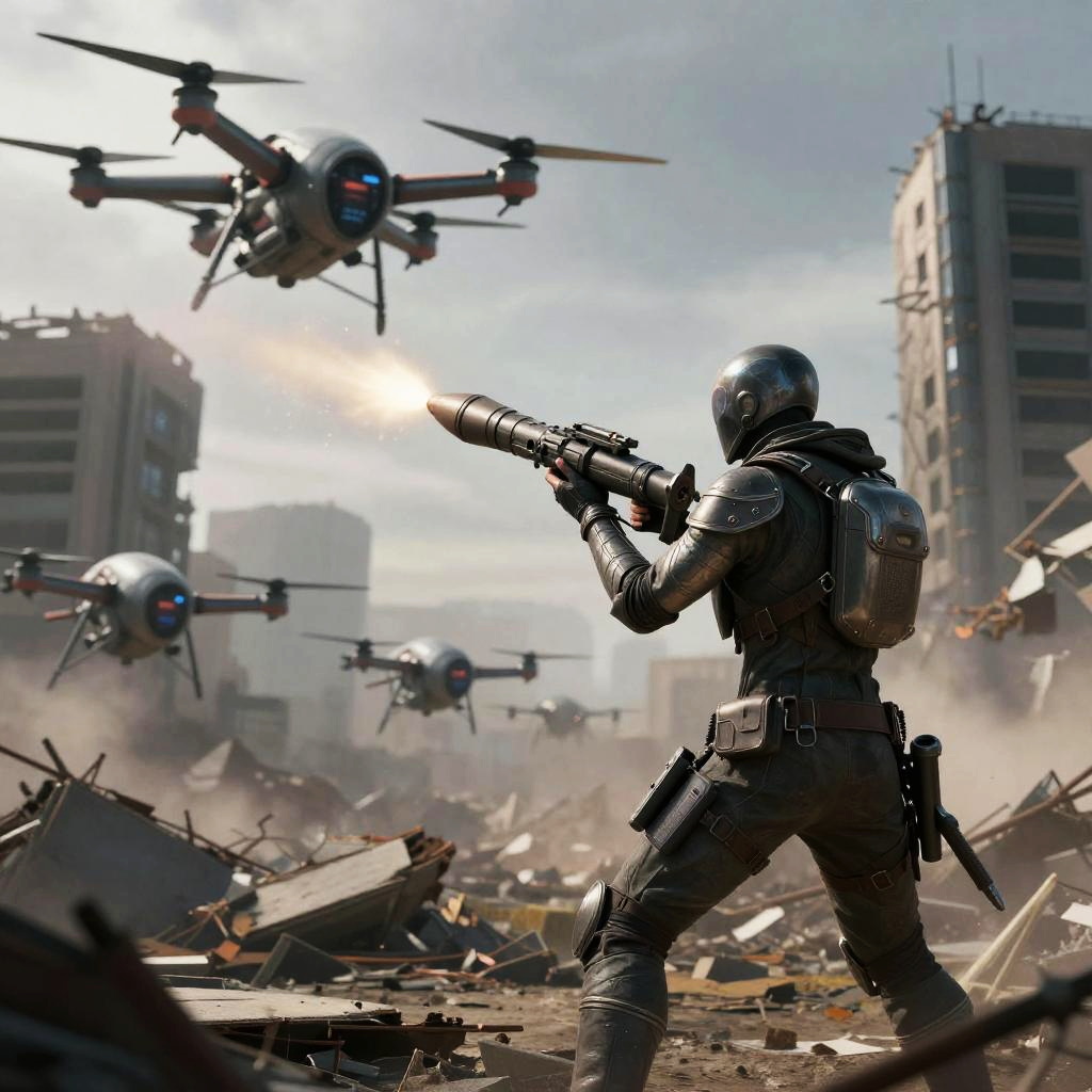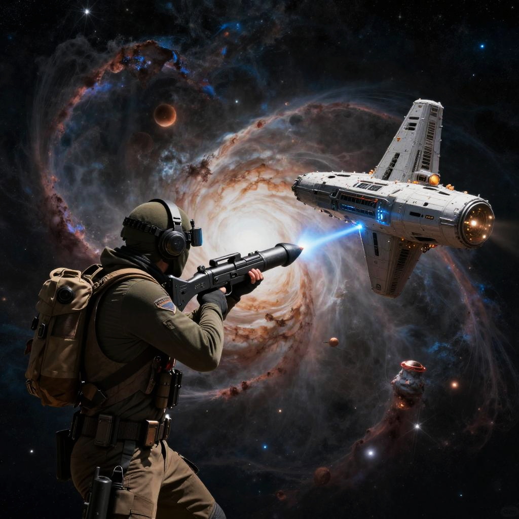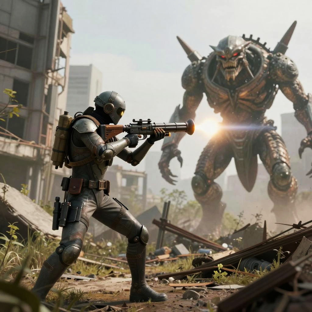 Epic scene of a fearless cybernetic commando aiming a rocket launcher at an underground lair in a digital neon city.