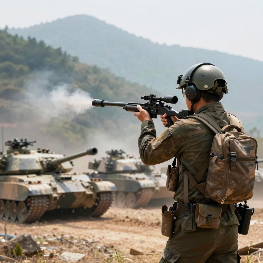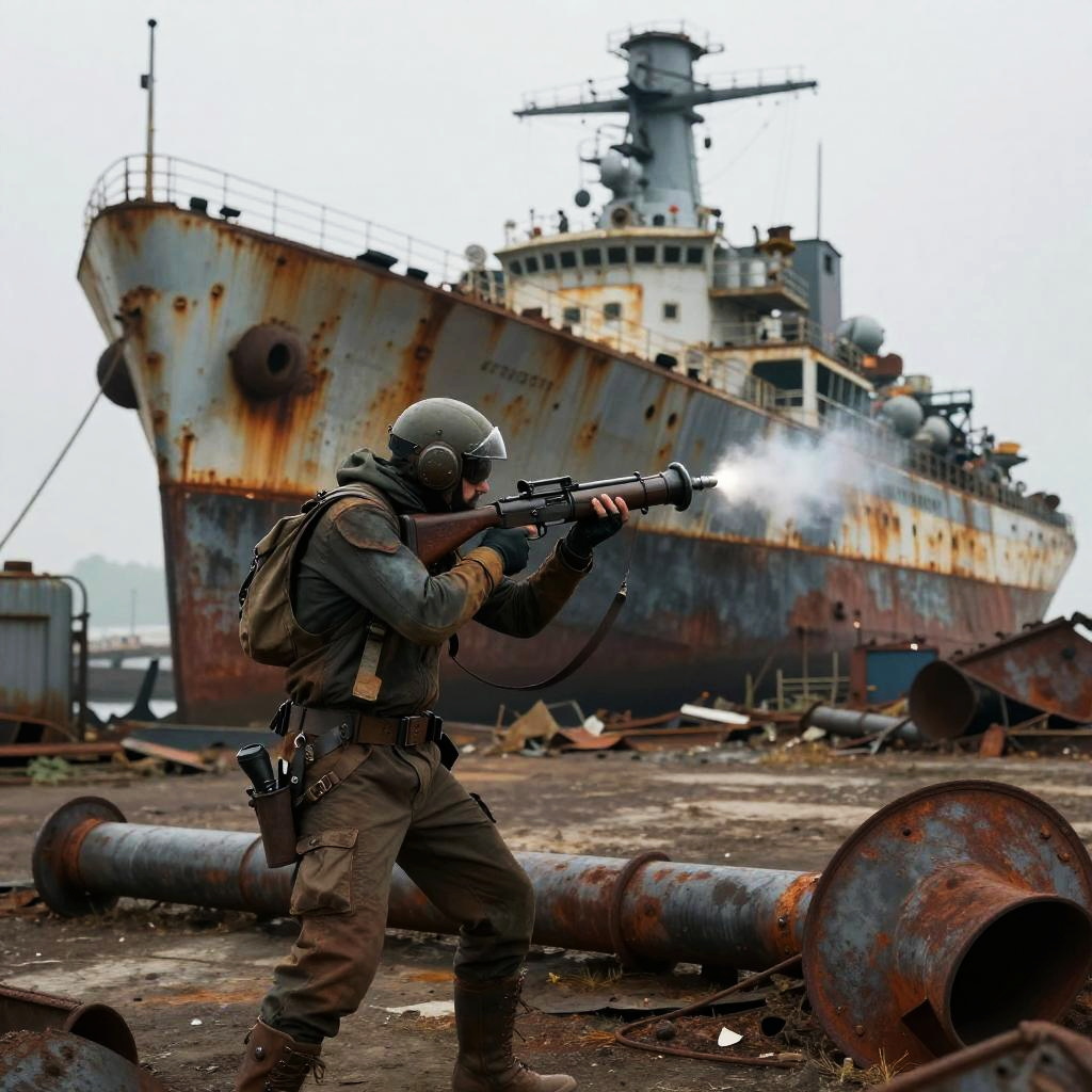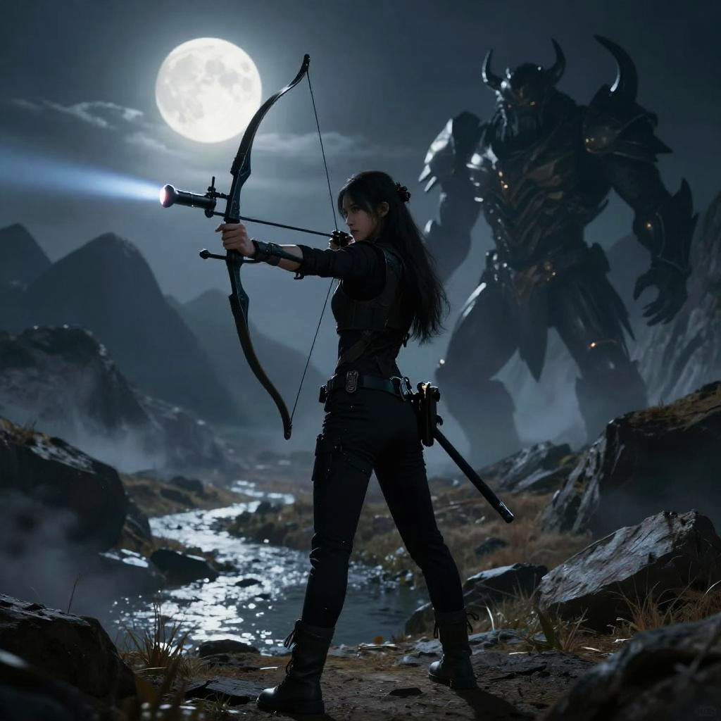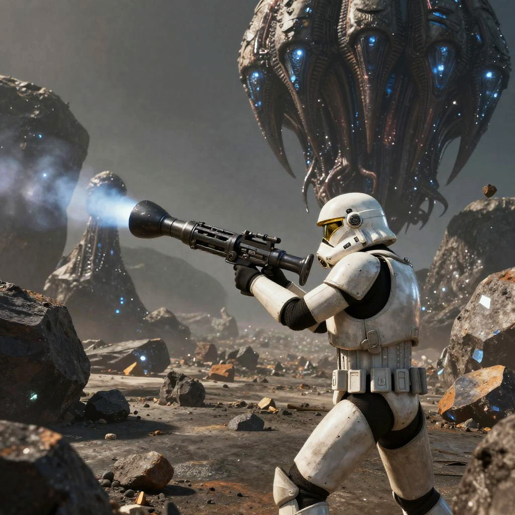 Epic scene of a fearless cybernetic commando aiming a rocket launcher at an underground lair in a digital neon city.