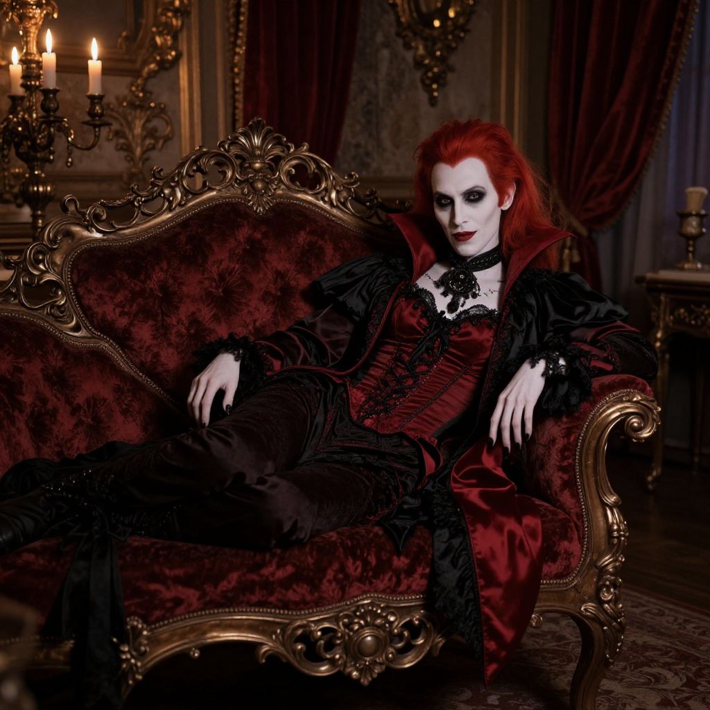 Red head vampire lounging in a Victorian-era parlor, ornate furniture and candlelight casting shadows, wearing elegant dark red and black attire, porcelain pale complexion, subtle sinister smile, richly textured environment with a mysterious vibe.