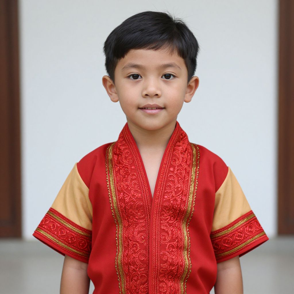 Simple Philippine National Costume, a close up of a young boy in a red and tan dress