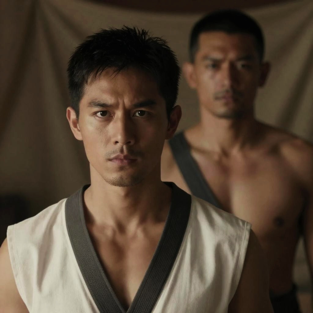 Photograph of a muscular blonde man in a striped tank top, stained with blood on his chest and arm, holding a microphone and looking down. Two other men with dark hair and serious expressions stand in the dimly lit industrial setting with visible pipes in the background.