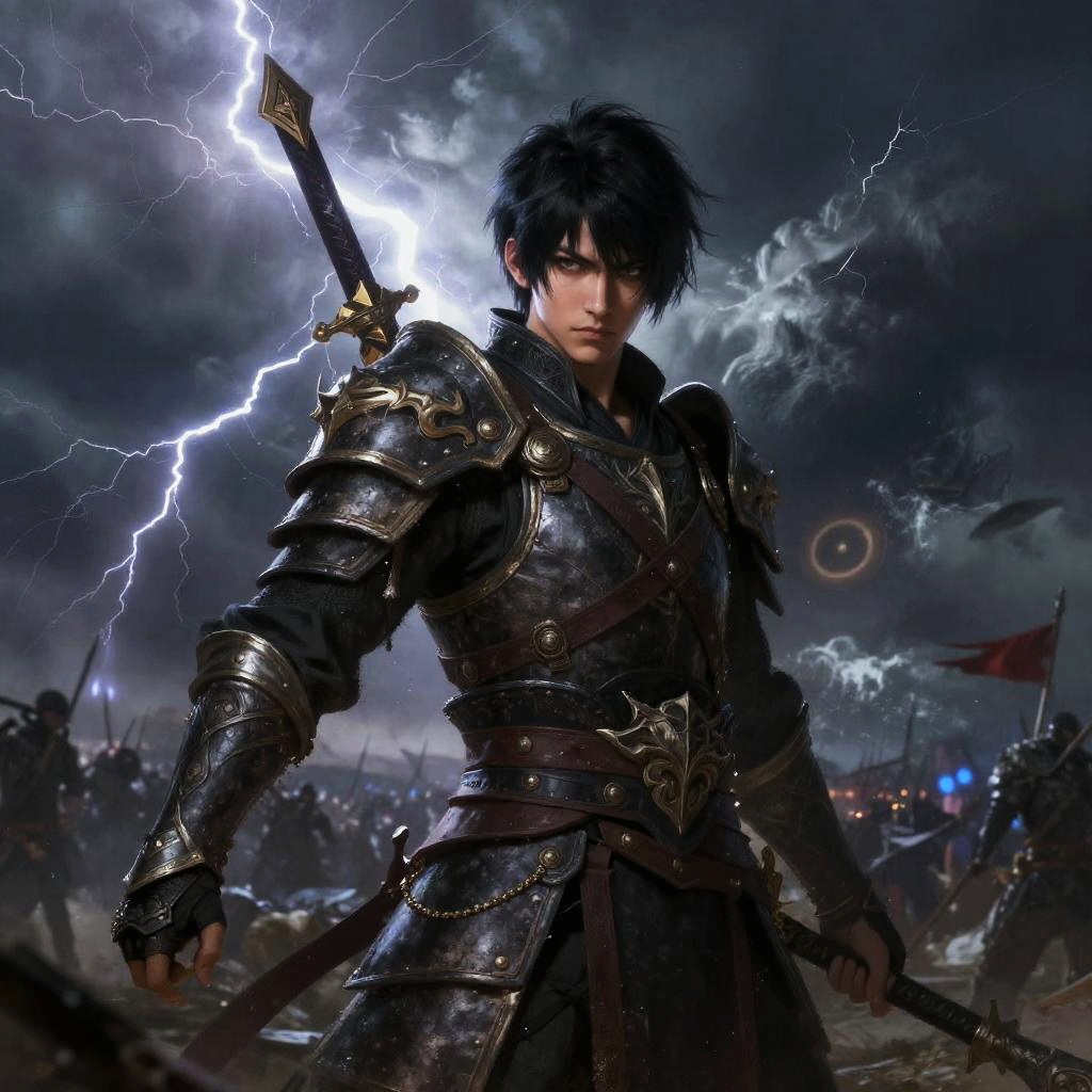 Red and black hair men depicted as mythical warriors in a fantasy realm, adorned with ornate armor with intricate details, glowing red and black hair flowing wildly, standing on a cliff under a stormy sky with lightning, epic and vivid fantasy illustration