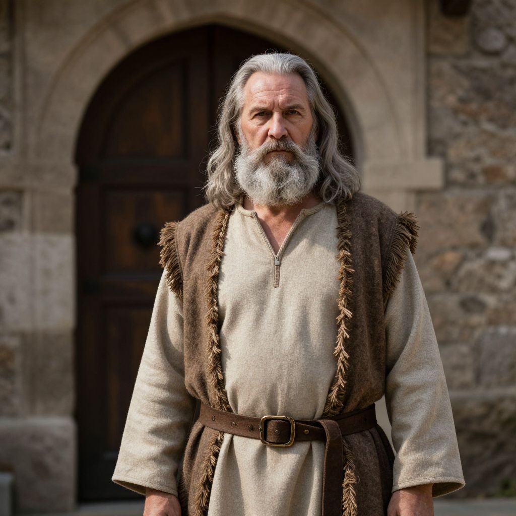 Portrait of an older man with long gray hair and beard wearing a beige tunic with a brown fringed woolen vest and leather belt. He stands in front of a dark wooden door set in a stone archway, with a serious expression. The sunlight highlights his face and clothing, enhancing the medieval atmosphere with a stone wall background.