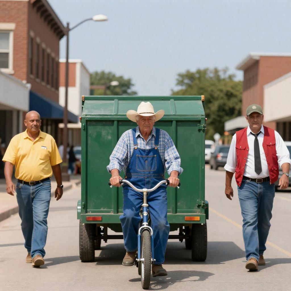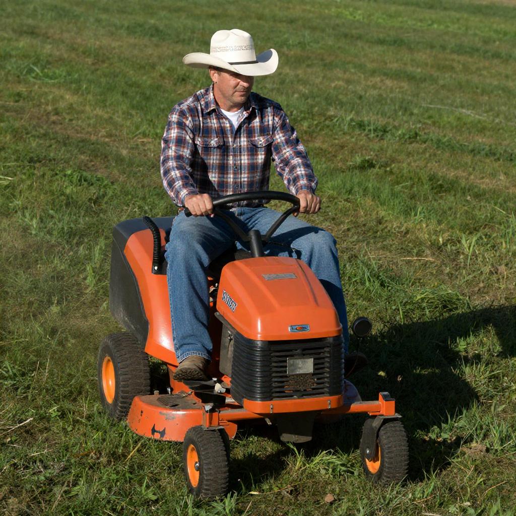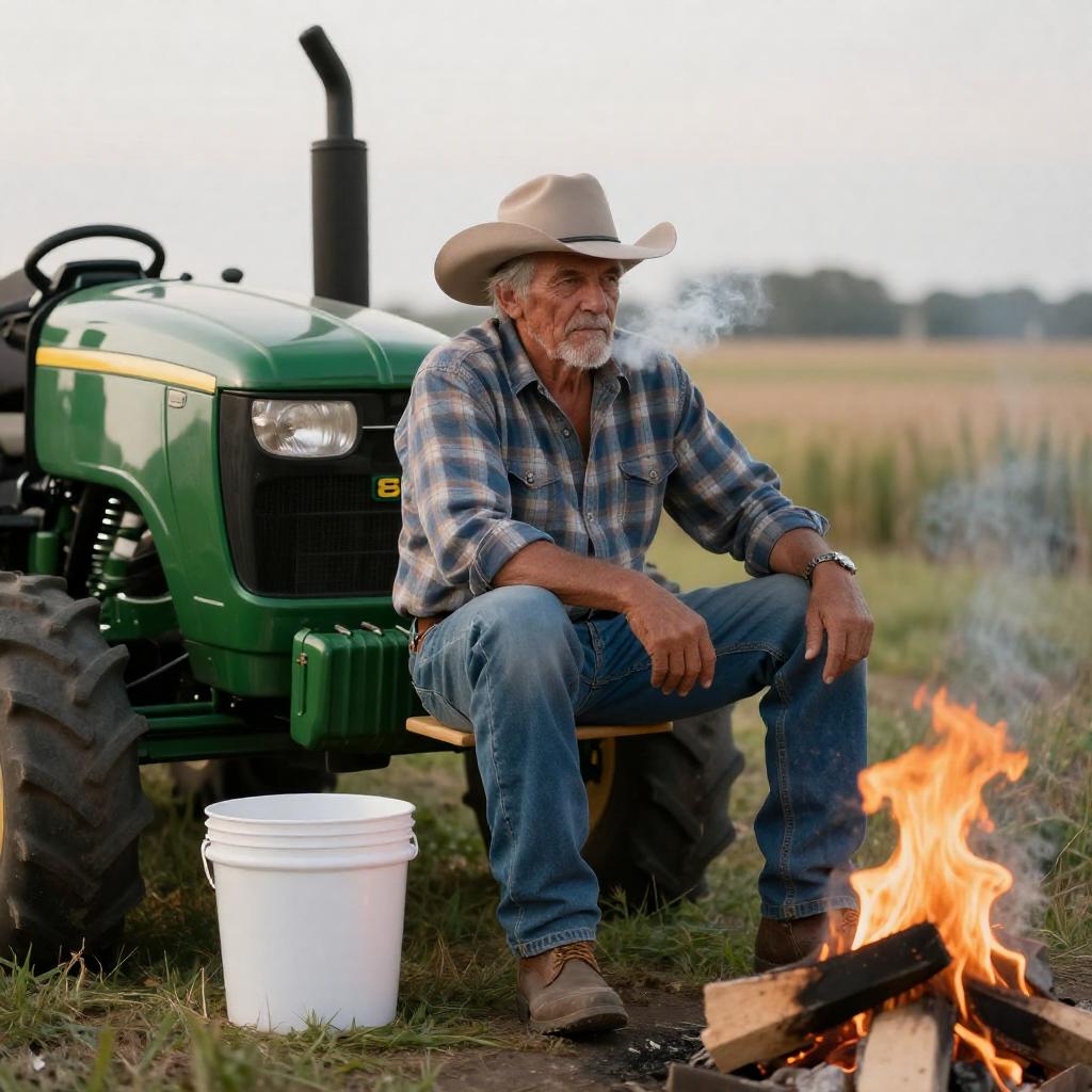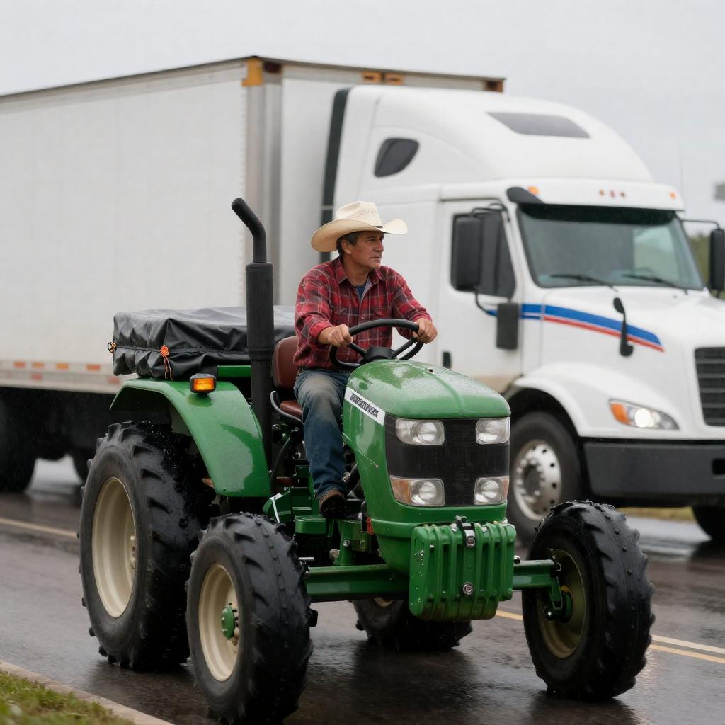 Photograph of a middle-aged man with a white cowboy hat and red plaid shirt driving a green tractor with a covered load, next to a large white semi-truck with blue and red stripes. Man looks to the right, truck in the background. Rainy road, overcast sky.