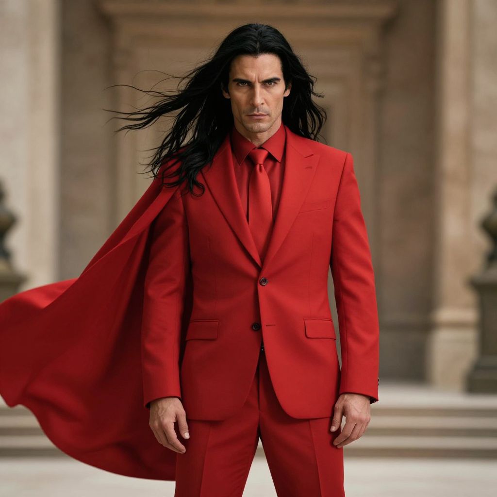 A man with long, flowing black hair stands confidently in a grand, atmospheric setting, wearing a bold red suit with a red tie and a flowing red cape that billows slightly in the wind. He has a serious, intense expression on his face, with deep, focused eyes that convey determination and quiet authority. The lighting is dramatic, with soft shadows and warm highlights enhancing the red tones of his outfit, giving the scene a cinematic and mysterious vibe.