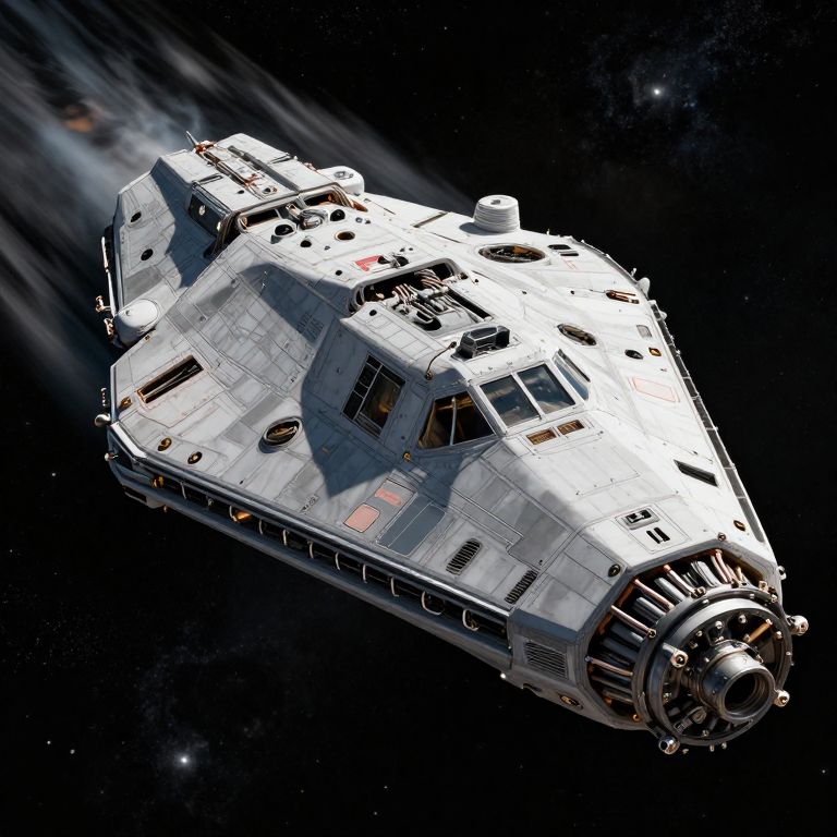 The image is featuring a large military spaceship, metallic details, including bolts, wires, and mechanical components, giving it a highly advanced, industrial military look, dark space background, motion blur, nebulae