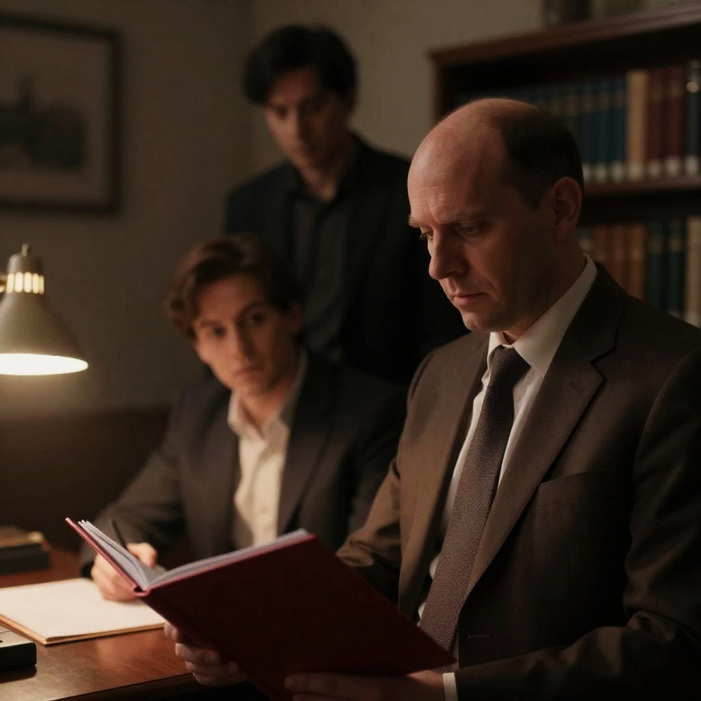 Photograph of two men in a room. Bald man with dark brown shirt, sad expression, holding brown book and papers. Young man with curly hair, green jacket, black shirt, surprised expression. Table with orange flowers, red cup, white plate. Framed pictures on wall, closed door in background.