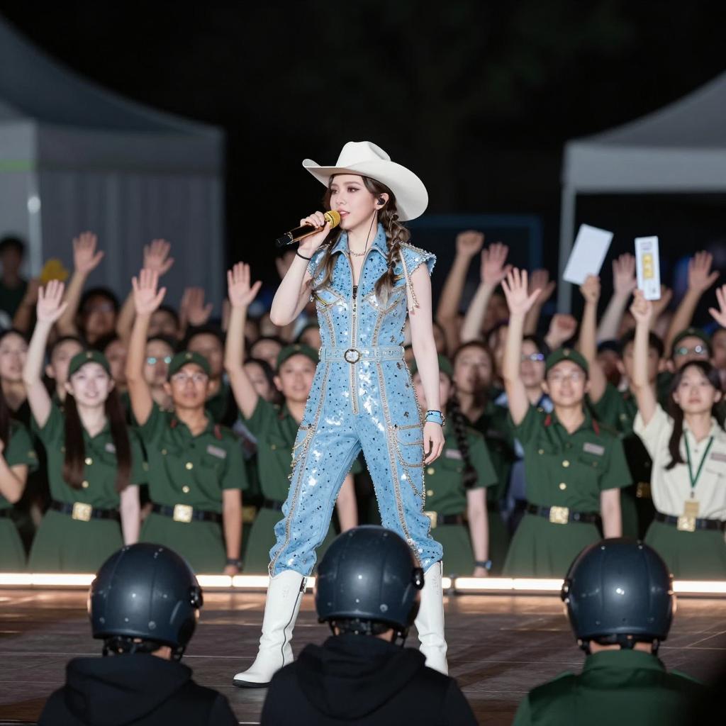 Live performance photograph. Female singer in white cowboy hat, blue sequined jumpsuit, and white boots sings on stage. Large crowd of people in green uniforms with raised arms and hands in background. Three people in dark helmets at stage front. Singer holds microphone, some audience members hold signs and objects. Nighttime setting.