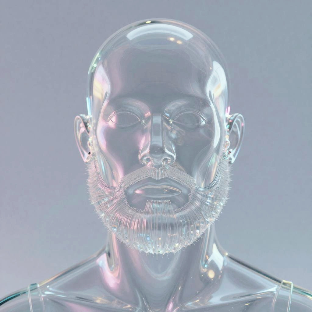 Close-up of a goatee transparent beard on a transparent mannequin head, futuristic cyberpunk style, neon reflections, high detail, sleek and minimalistic background