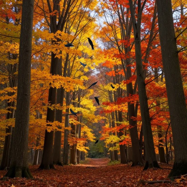 Amidst the fiery embrace of autumn, a forest whispers secrets of transience, its vibrant hues and soaring birds echoing the dance between freedom and the inevitable passage of time.