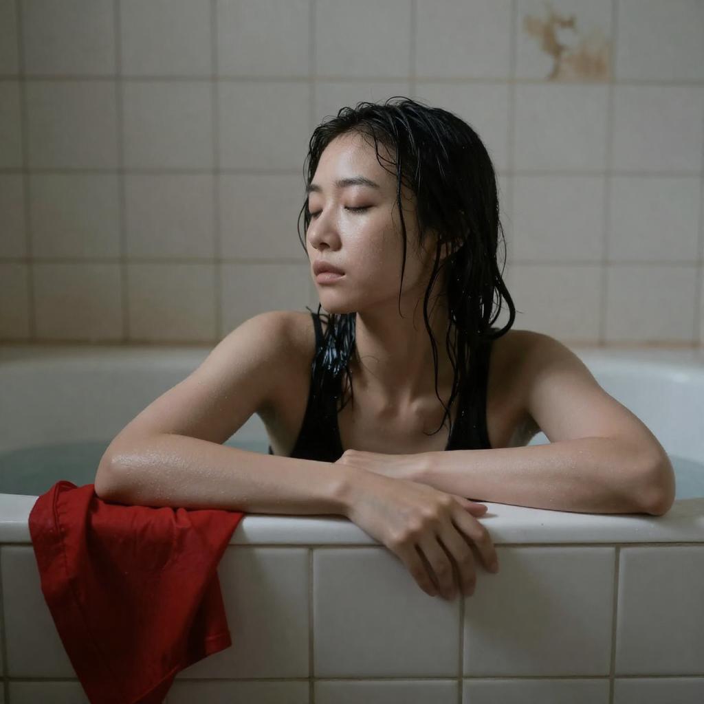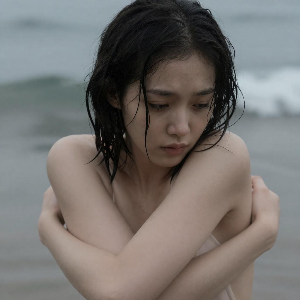 Photograph of a young woman with wet, dark, tangled hair hugging her arms tightly against her chest. She has a sad, downcast expression with eyes partially closed. Her skin is fair and slightly wet. Background shows blurred, grayish sea waves.