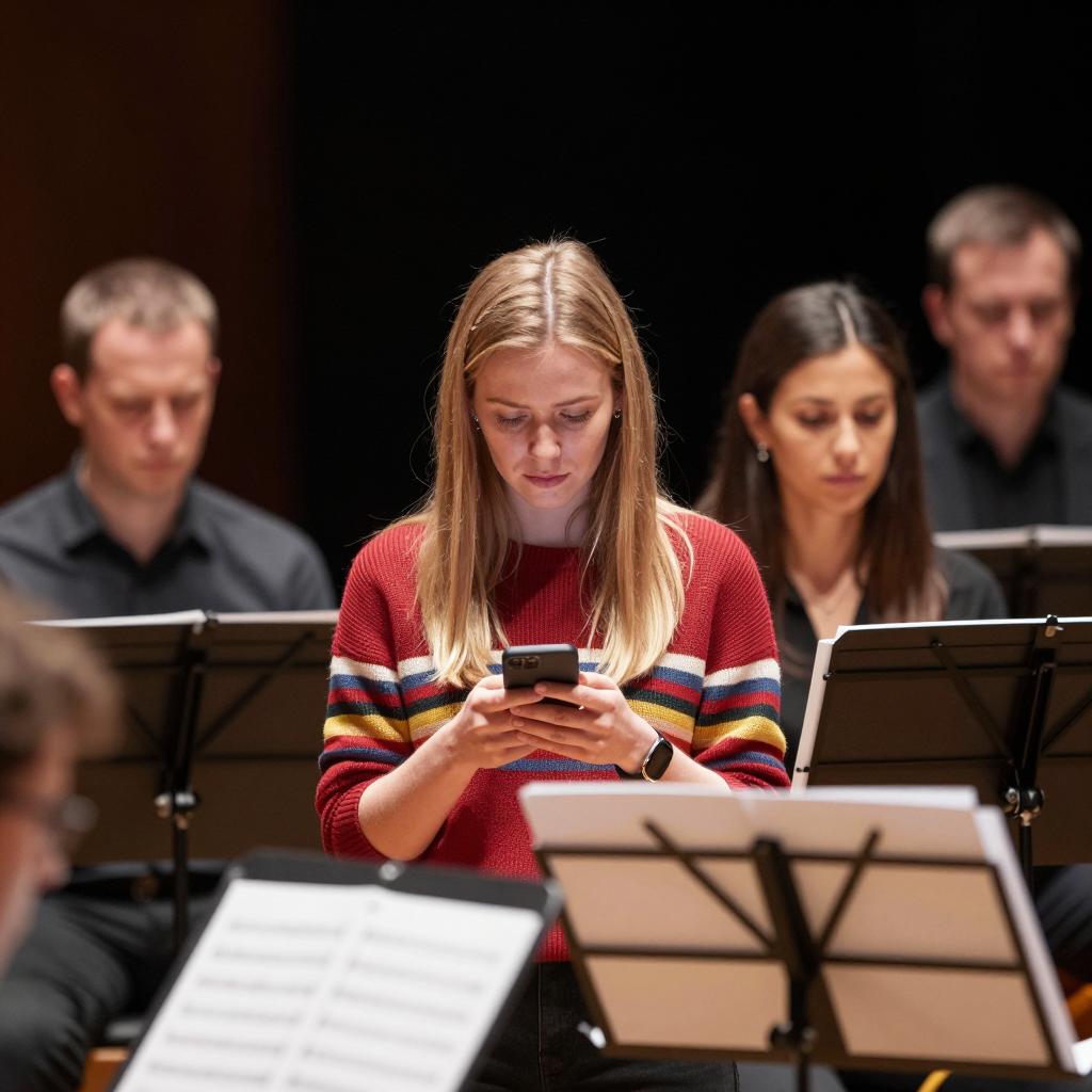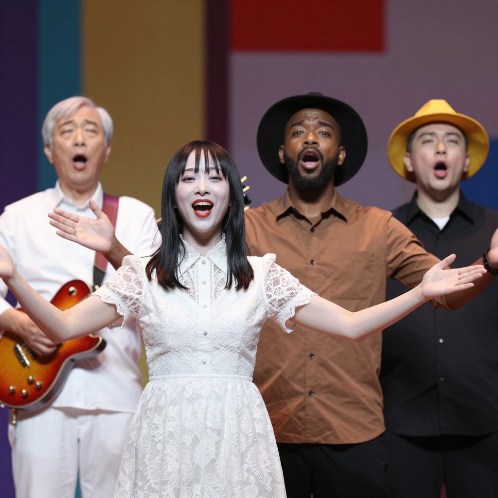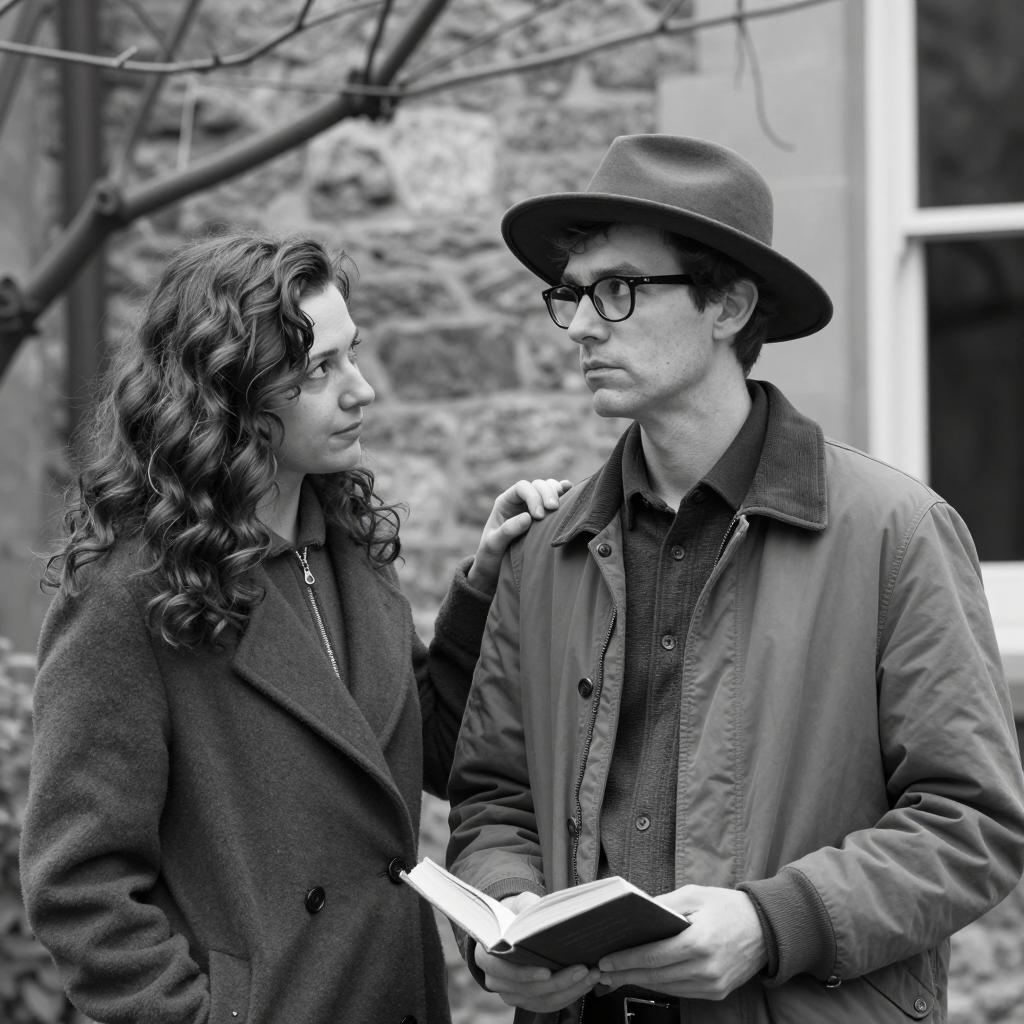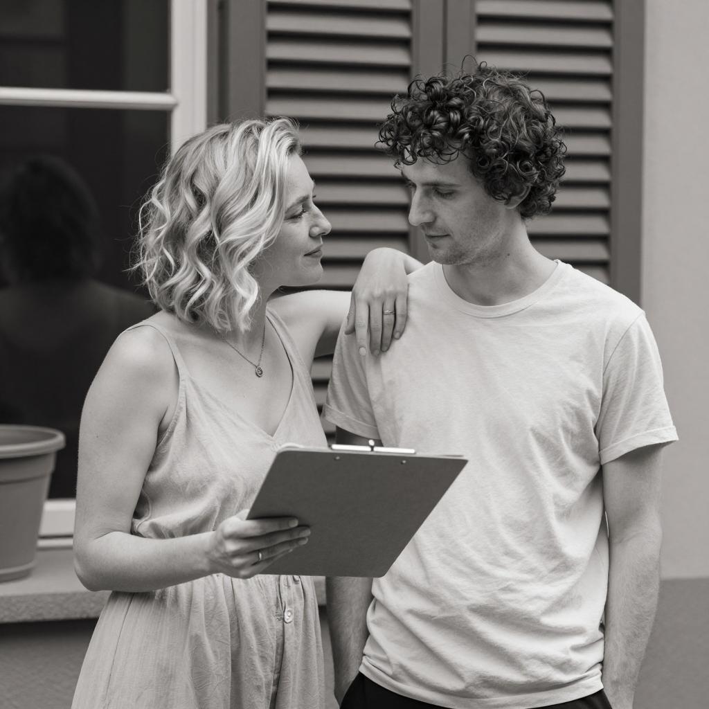 Three people in a room. Short-haired man with red and navy striped shirt on the left, gesturing with his right hand. Brown-haired woman in red and white striped dress in the center, mouth open, arms extended. Shirtless man with glasses and floral pants on the right, facing the woman. Background: yellow wall, blue artwork, stairs.