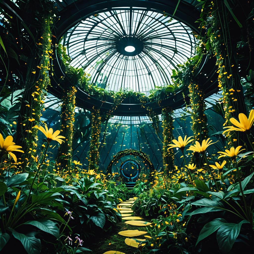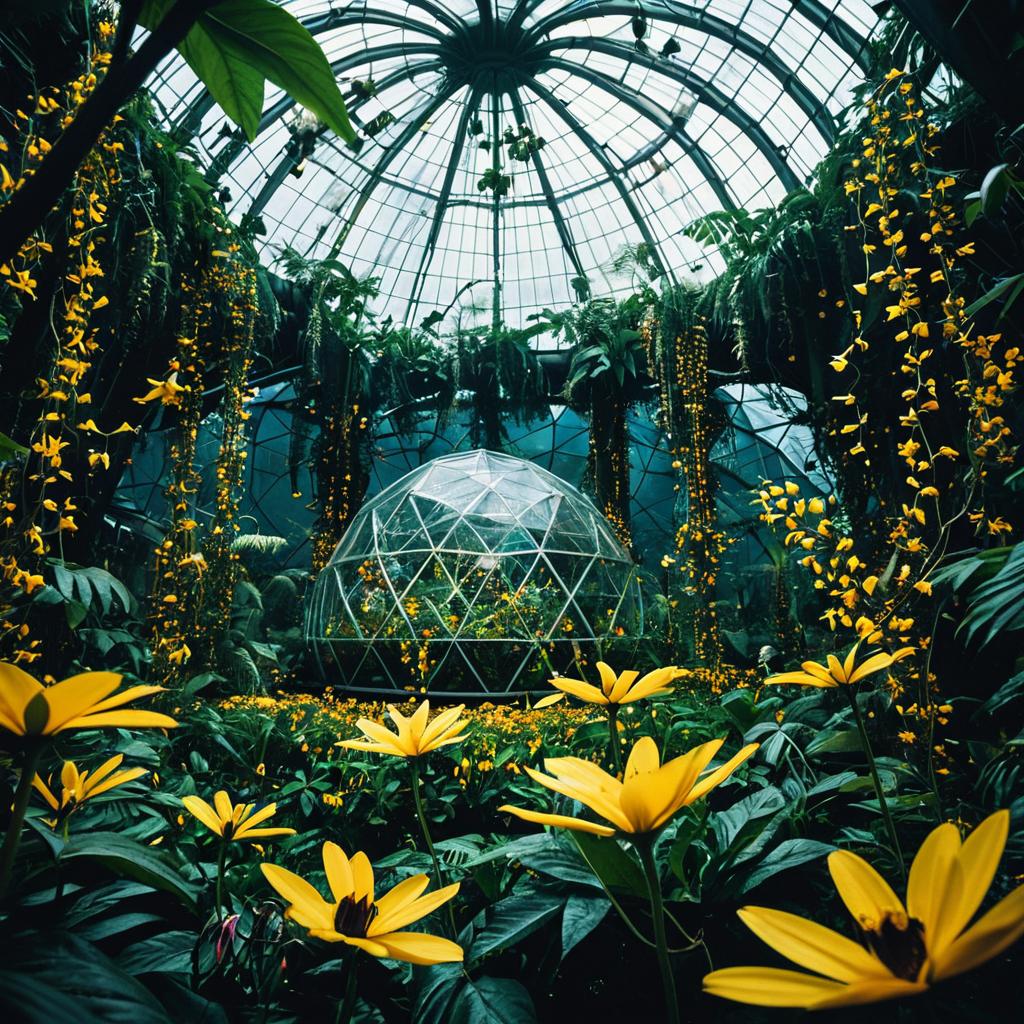 Interior view of a large biodome jungle featuring a geometric glass dome ceiling and a smaller futuristic geodesic dome structure in the center. The scene is filled with luminous yellow flowers and dense greenery, with vines hanging and intertwining, illuminated by dramatic, cinematic lighting. Synthetic pollinators hover around the plants in this highly realistic, futuristic setting.