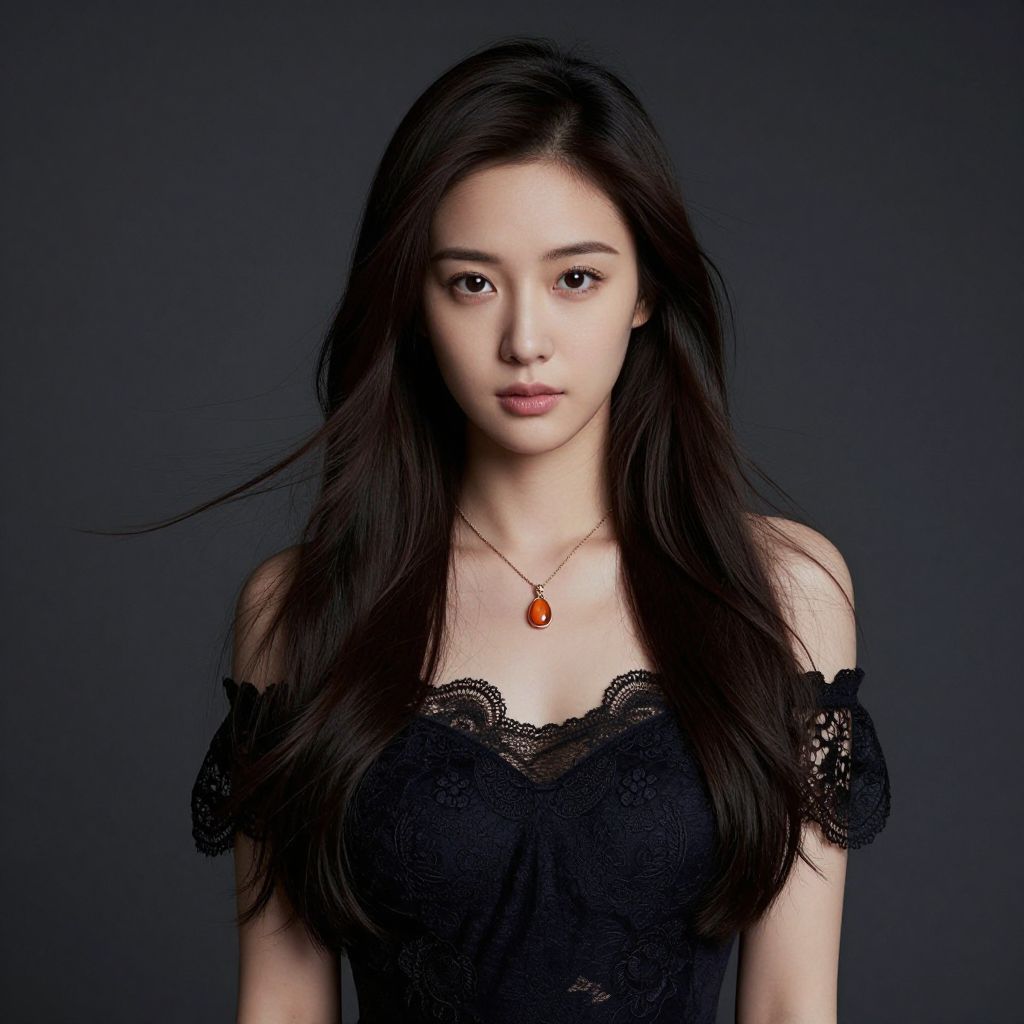 Digital portrait of an Asian woman with long black hair, red lipstick, and black clothing, against a dark, textured background with Japanese characters. Moody,