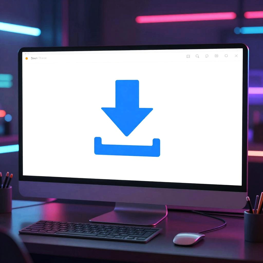 Dreamstime downloader without watermark concept, stylized digital workspace with multiple image previews appearing without watermarks, emphasis on smooth rapid downloading process, cyberpunk futuristic environment with vivid neon lights and reflections
