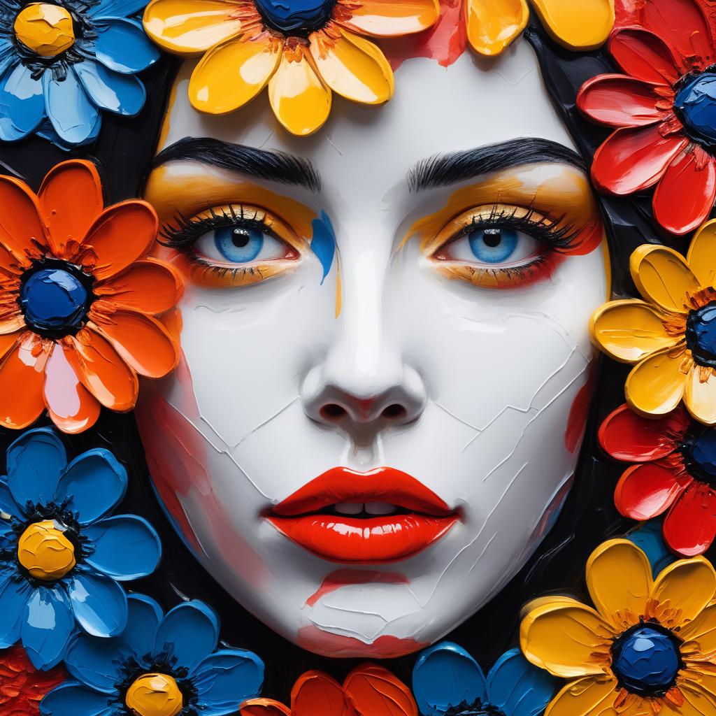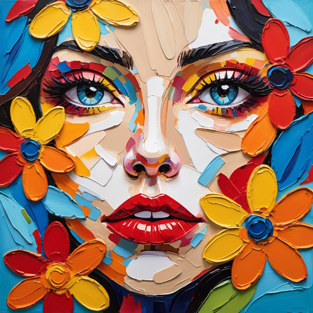 A close-up portrait of a woman's face with expressive eyes and full lips, surrounded by abstract colorful flowers, painted in impasto style with vivid red, yellow, blue, and orange colors, thick textured brushstrokes, contemporary modern art painting
