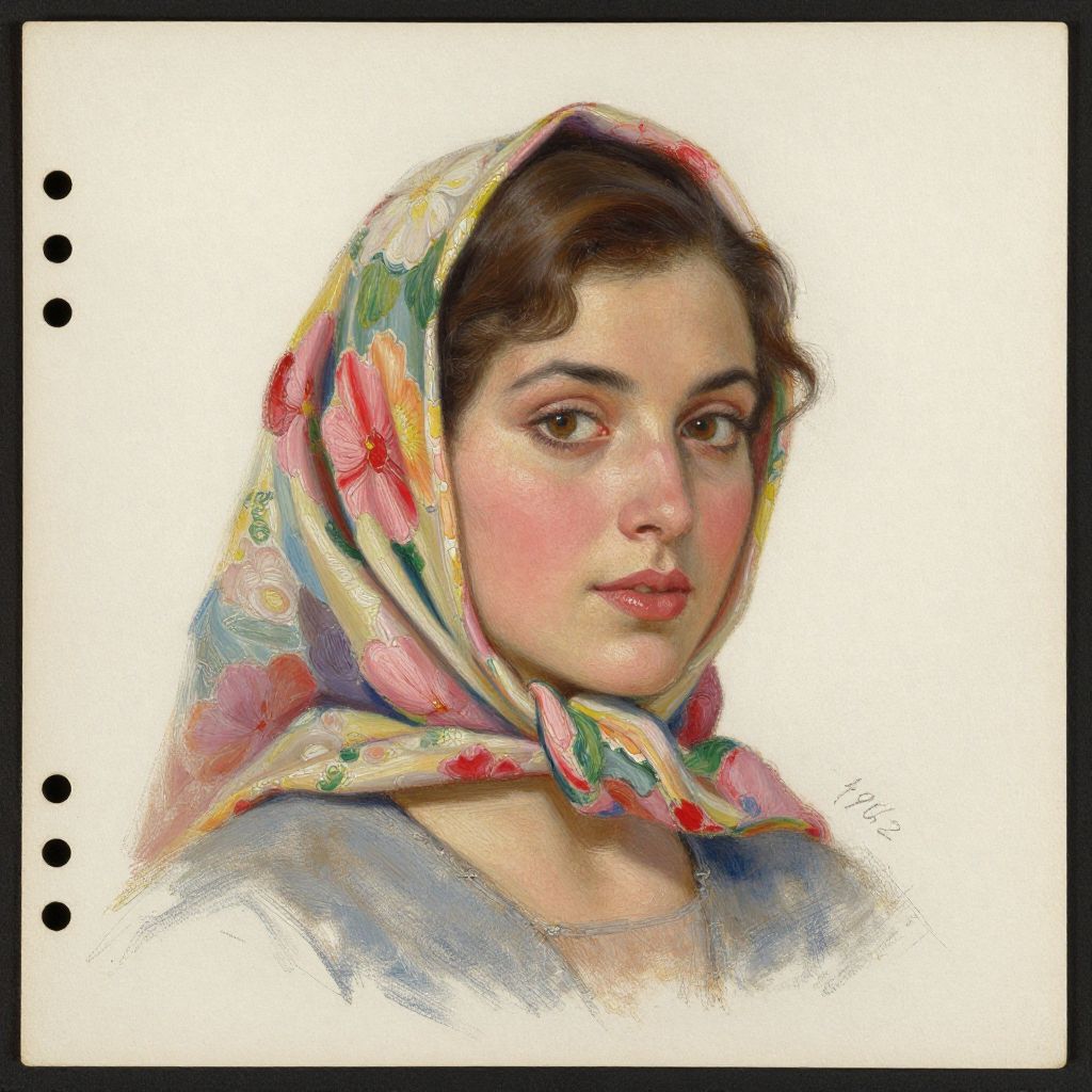 A portrait study of a woman adorned with a floral headscarf, rendered in a realistic oil painting style on card, featuring intricate details and warm tones, signed and dated 1962.