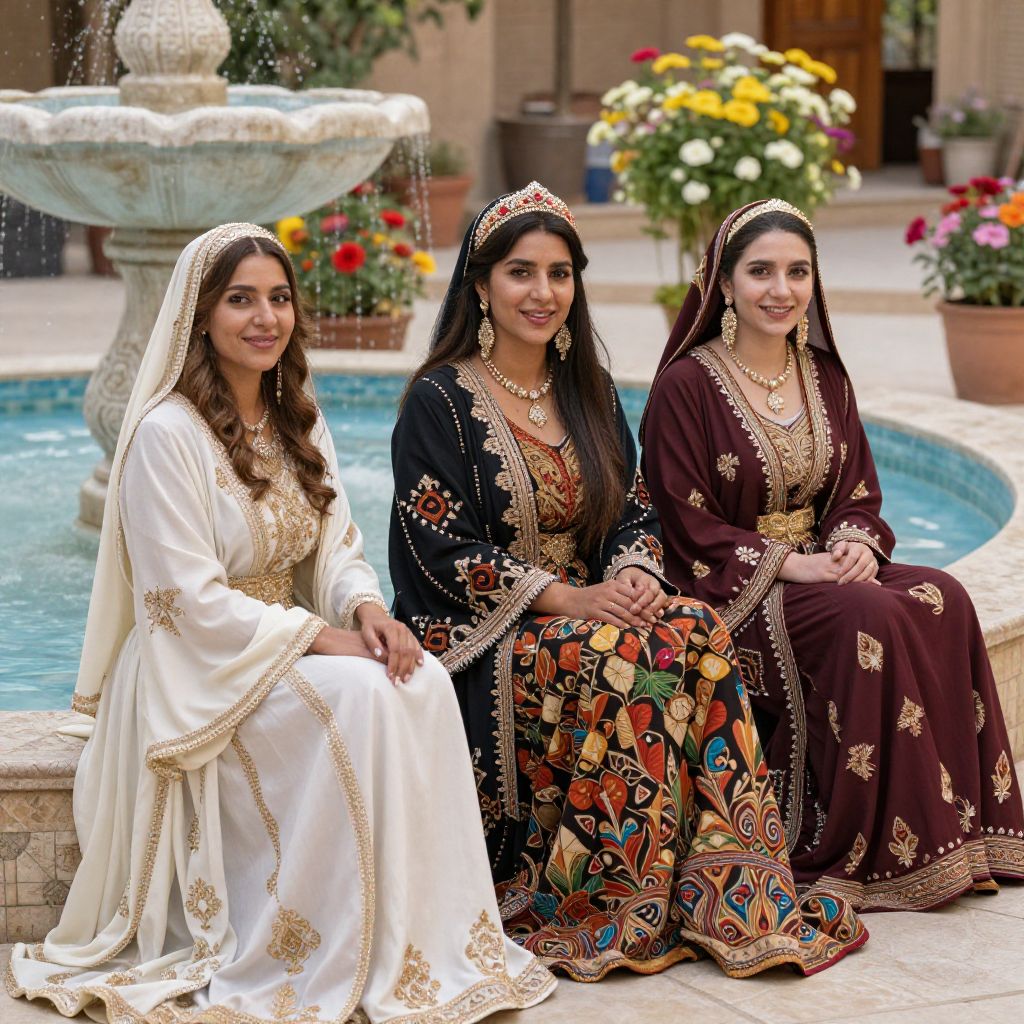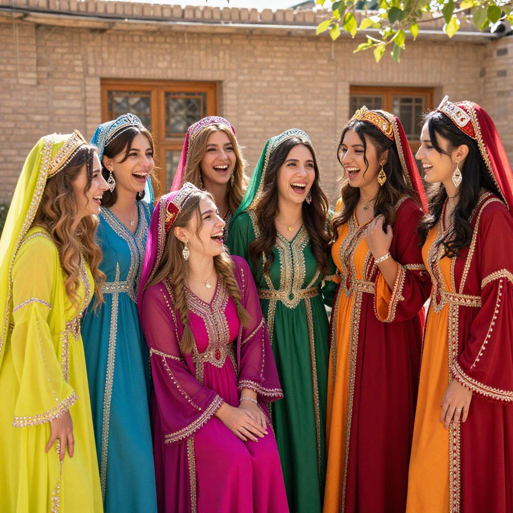 Group of beautiful Afghan women laughing together in a sunlit courtyard, wearing bright dresses and ornate headpieces, rich textures, vibrant colors, lively and joyful atmosphere