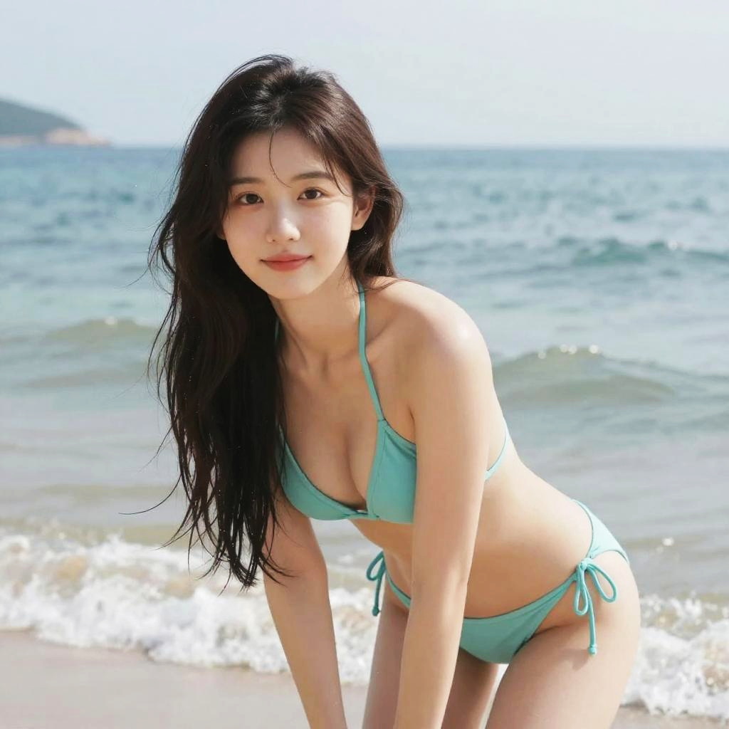Best quality, ultra high res, (photorealistic:1.4), (detailed beautiful girl:1.4), (medium breasts:0.8), looking_at_viewer, Detailed facial details, beautiful detailed eyes, (blue|pink hair), green eyes, slender, smile, (makeup:0.4), red lips, (full body, sitting, beach), highly detailed clothes, (ulzzang-6500-v1.1:0.3)