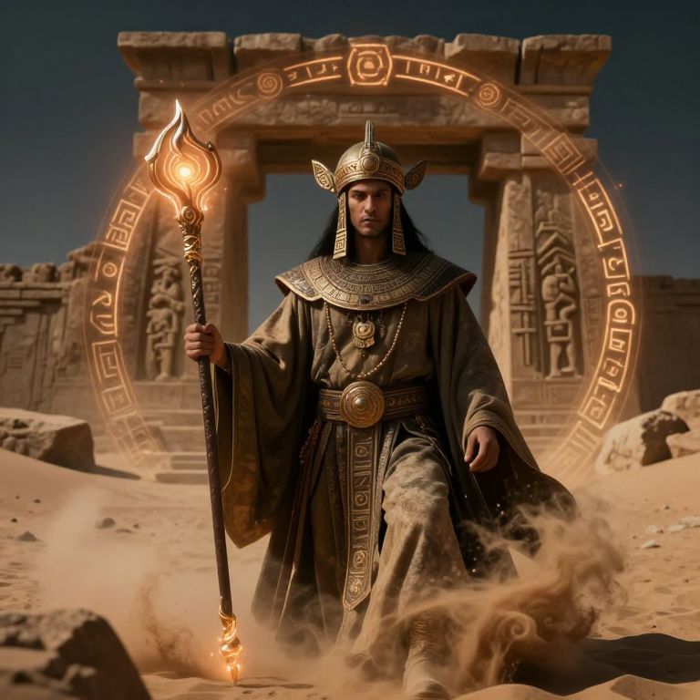 Rammah, a mystical guardian of ancient ruins, surrounded by swirling sands and glowing runes, wearing ceremonial headdress and holding a staff imbued with magical energy, with an epic and moody atmosphere in a fantasy setting.