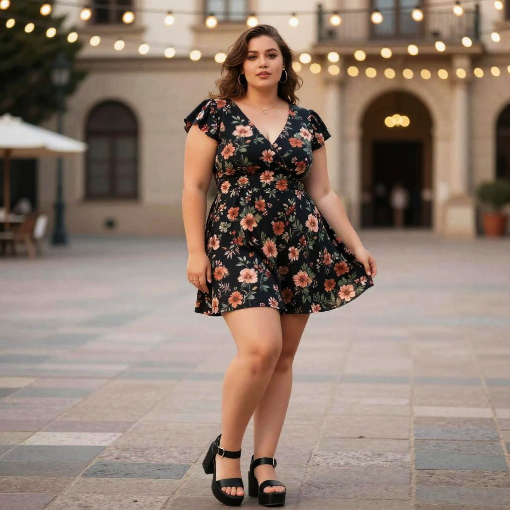 A Plus-size woman in a sleek emerald green satin mini dress with thin spaghetti straps and a fitted silhouette, paired with nude strappy high-heeled sandals, stands confidently in a bustling 1910s Berlin market square, surrounded by vibrant stalls and lively crowds, captured in a vivid visual style. Sexy. Pretty face and beutiful eyes