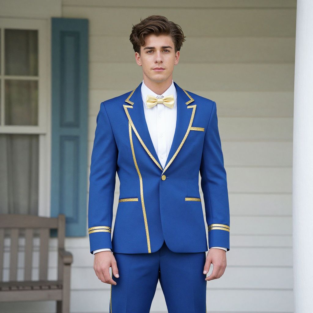 Photograph of a young, fair-skinned man with brown hair, wearing a blue and gold tuxedo with a bow tie, standing in front