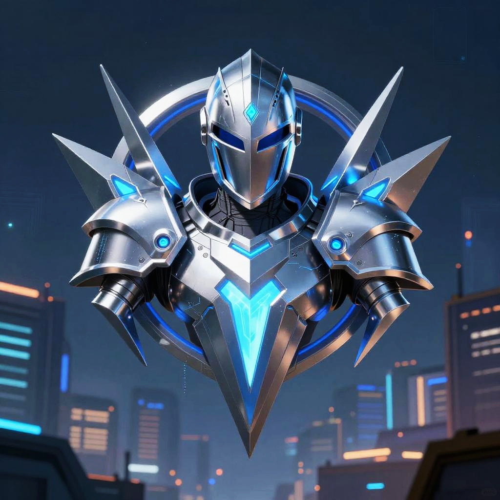 Futuristic knight emblem with sleek chrome and neon blue accents, cyberpunk cityscape in the background, sharp angular shapes, glowing effects, digital art