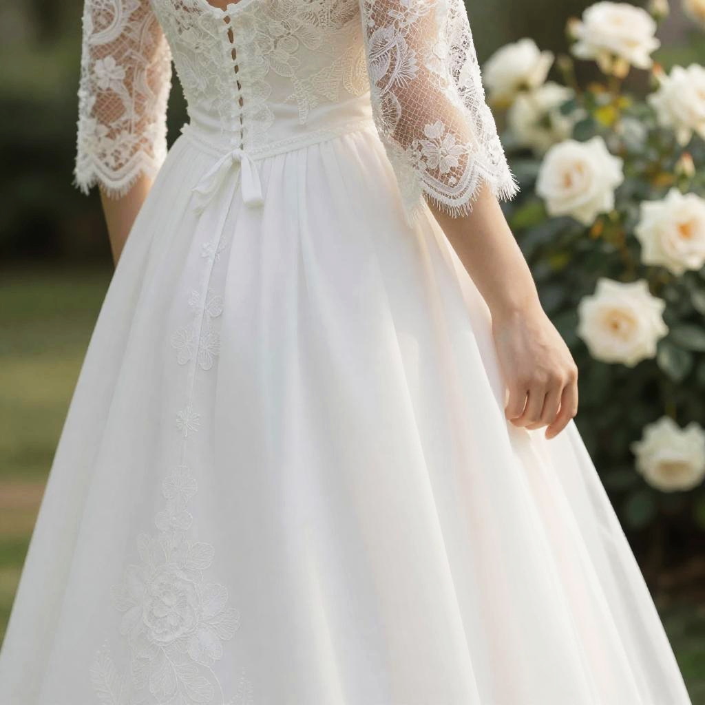 Close-up of a white maiden dress featuring intricate lace sleeves and flowing skirt, soft folds catching the light, with a subtle garden of white roses in the background