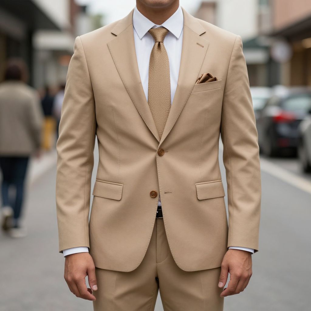 Photograph of a man from the neck to the waist, wearing a tailored, beige suit with a white dress shirt and a gold patterned tie. The suit jacket has a single button fastened, a pocket square peeking from the breast pocket, and two flap pockets on the front. His hands are relaxed at his sides. The background is a blurred urban street scene with a few indistinct people, parked cars, and buildings. The lighting is natural, highlighting the suit's smooth texture and the man's formal, polished appearance.