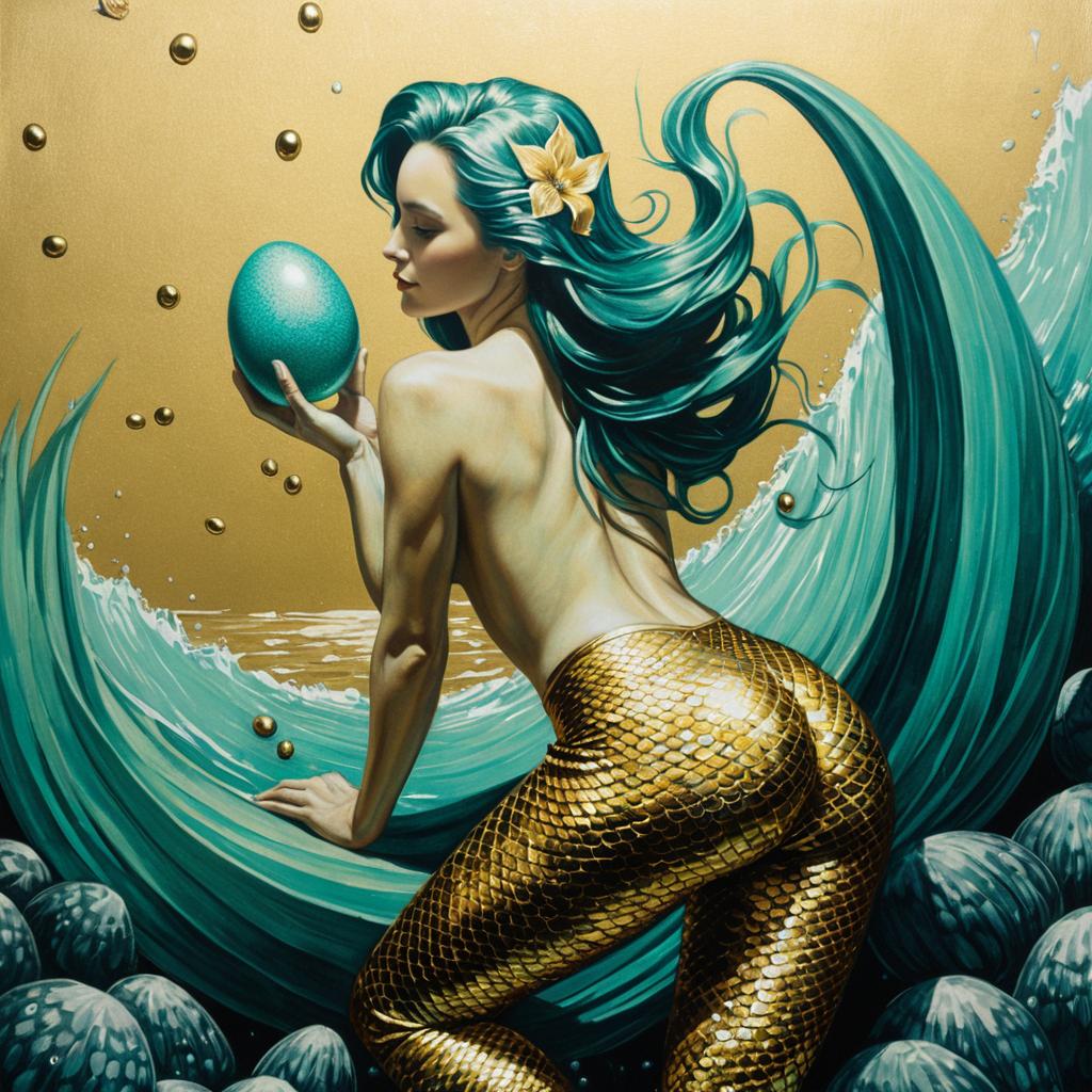 Artistic painting of a mermaid with long aquamarine hair holding a large egg. The mermaid's tail is depicted with dark gold scales, contrasting against a background of stylized aquamarine waves and a light yellow-gold backdrop. The painting showcases a fanciful costume design with rich textures and a colorful, muralist style.