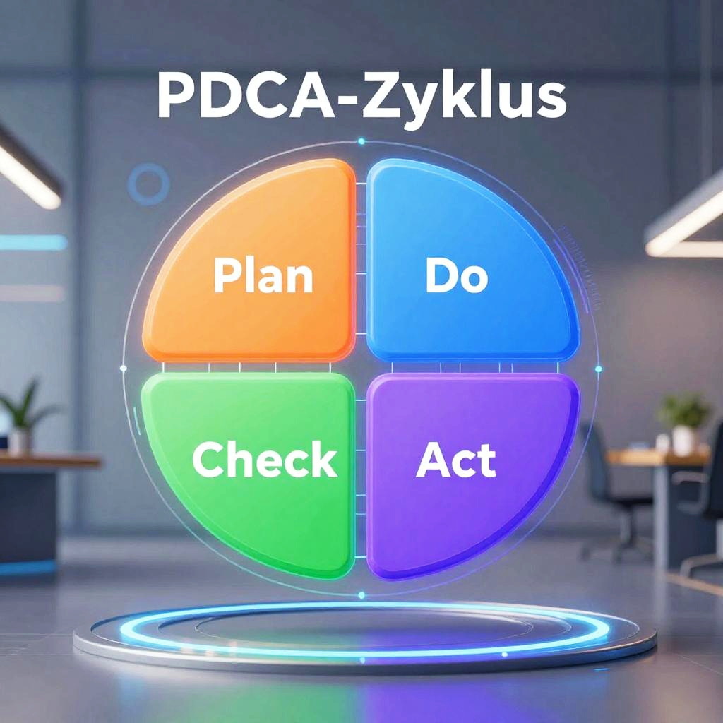PDCA-Zyklus visualized as a sleek, modern infographic with four vibrant, interconnected segments labeled Plan, Do, Check, Act on a futuristic digital interface, glowing neon colors, sharp typography, minimalistic design, high-tech business environment background