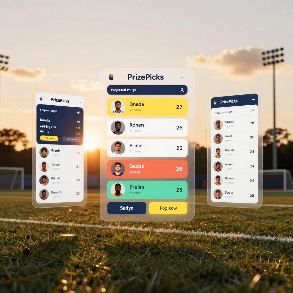 Creative composition featuring PrizePicks game interface floating above a sports field at sunset, translucent UI panels showing projected player stats, dynamic lighting effects, hyper-realistic textures combined with digital graphic overlays, inspiring immersive sports analytics vibe