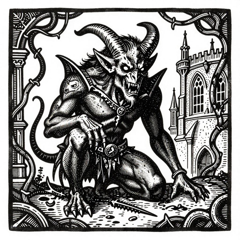 Medieval demon woodcut style illustration of a fearsome horned demon with intricate detailing, surrounded by twisted vines and gothic architecture, rendered in black and white with bold lines and woodcut texture, evoking dark fantasy and ancient folklore.