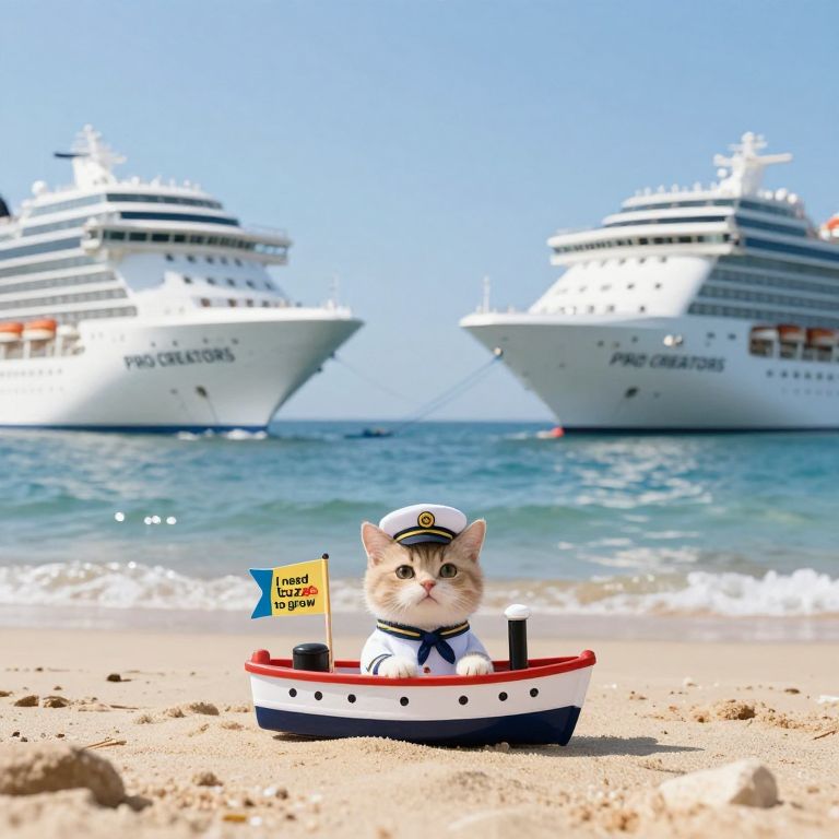Beautiful beach, 2 bigg cruises on the sea one in each side of the photo the cruises have an \"PRO CREATORS\" logo on it's side, in the middle of the image a little happy cat captain in a little steam boat with a flag, the flag has an \"I need buzz to grow\" logo on it
