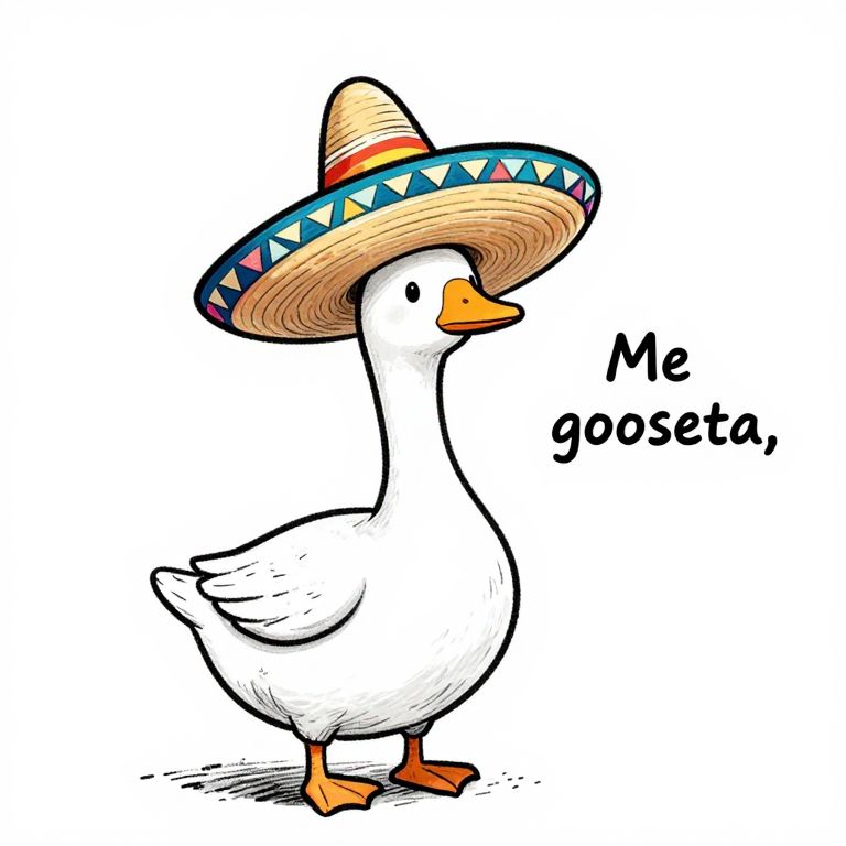 A humorous cartoon illustration of a white goose wearing a large colorful Mexican sombrero, The goose is depicted in a minimalistic black-and-white sketch style, with subtle shading to add depth, The sombrero is vividly colored with traditional Mexican patterns, including a border of triangular shapes, To the right of the goose, a handwritten-style text reads \"Me gooseta, \" emphasizing the humorous tone, The illustration is clean and simple, with a focus on the playful and quirky concept