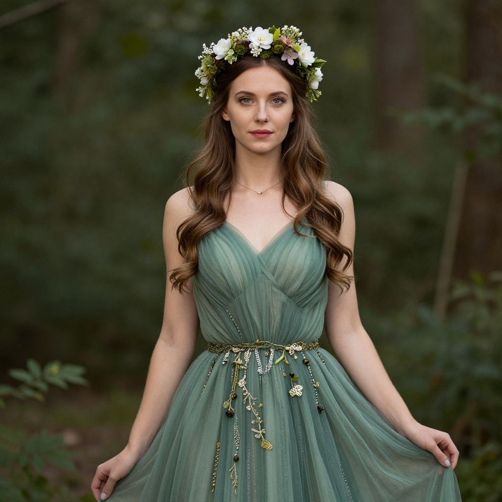 Photograph of a fair-skinned woman with long, wavy brown hair, wearing a sheer, sage-green, V-neck dress with a floral belt and intricate gold accents. She has a delicate flower crown of white and green flowers on her head. Her expression is calm and her blue eyes are softly focused. She stands in a forest with blurred green foliage in the background. The dress's fabric is light and flowing, contrasting with her more structured hair and crown. The overall style is ethereal and nature-inspired, evoking a fairy-tale or fantasy theme.