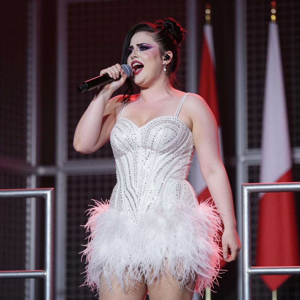 Woman with voluminous blonde hair, wearing a sleeveless red top, holds a black microphone, singing passionately. Red curtain background, intense expression, side profile, close-up. Red stage light on the left.