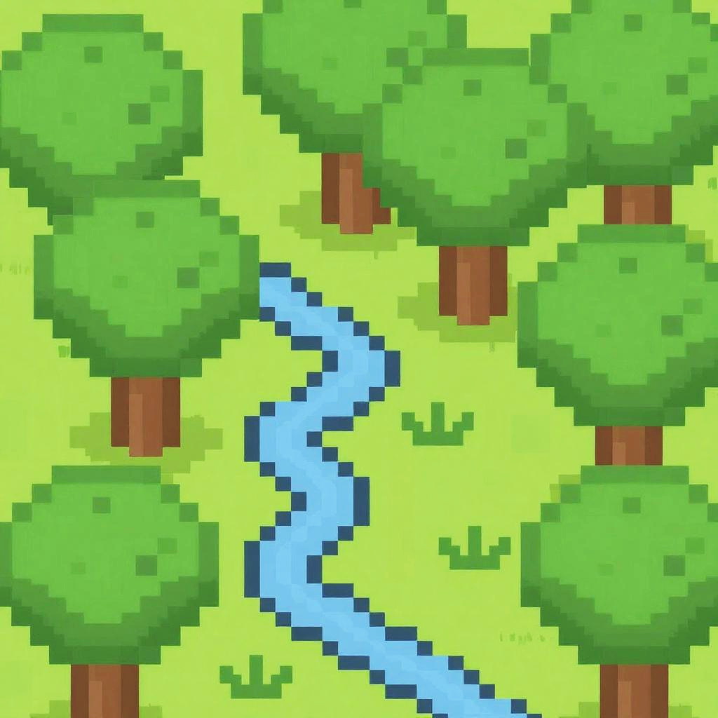 8 bit art generator producing a pixelated fantasy forest scene, bright green trees with blocky leaves, a small pixelated river winding through, classic 8 bit style with a focus on simple shapes and bold colors, charming and playful