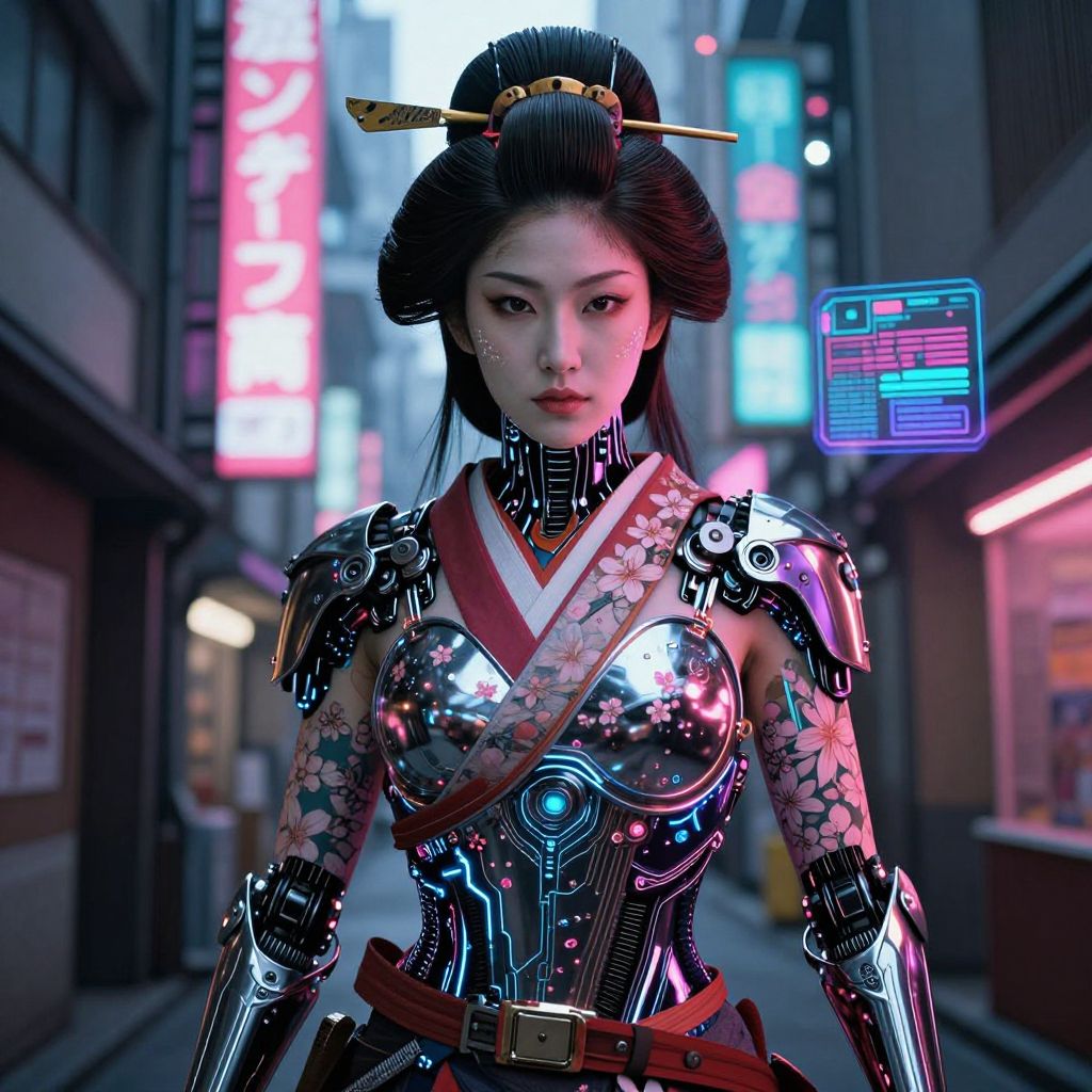 A cyberpunk portrait captures a Japanese samurai woman standing defiantly in a futuristic alleyway, illuminated by neon lights and holographic advertisements. Cherry blossom tattoos cover her exposed skin, blending traditional motifs with cutting-edge technology as sleek metallic armor and embedded glowing circuits reveal intricate details from a 'bug's-eye view'. Her resolute stance amidst the stark contrast of ancient tradition and modern dystopia casts an ethereal glow on her face, emphasizing her piercing gaze in a world where past wisdom converges with digital innovation. This image evokes a style reminiscent of Yuichiro Miyama's cyberpunk artwork, inviting contemplation of how traditional elements interact with futuristic advancements.
