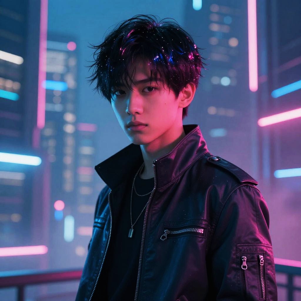 Photograph of a young Asian man with tousled black hair, wearing a black hoodie, illuminated by neon blue holographic icons against a nighttime city skyline
