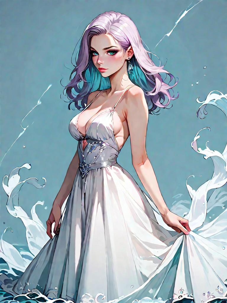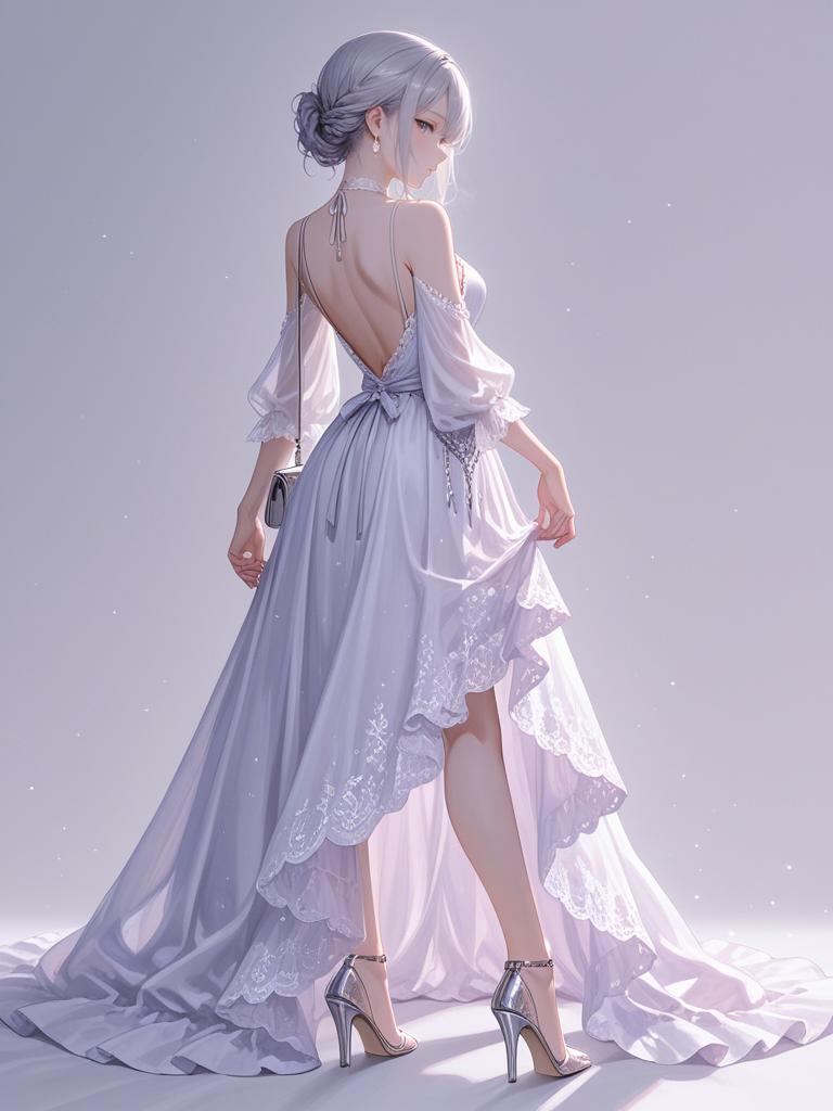1girl, realistic face, Backless chiffon dress, flowing silhouette, soft lavender chiffon, delicate lace trim, adjustable spaghetti straps, paired with strappy silver heels, minimalistic silver jewelry, elegant clutch bag, light makeup, soft waves hairstyle.