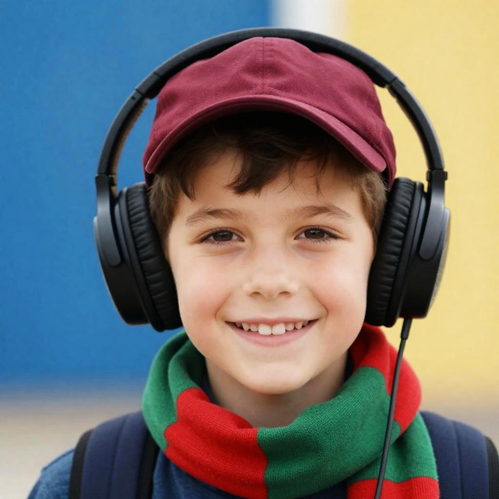 Photograph of a smiling young boy with fair skin, brown hair, wearing a maroon cap, black headphones, and a multicolored red and green scarf. Blurred background with blue and yellow hues. Boy's face is close to the camera.