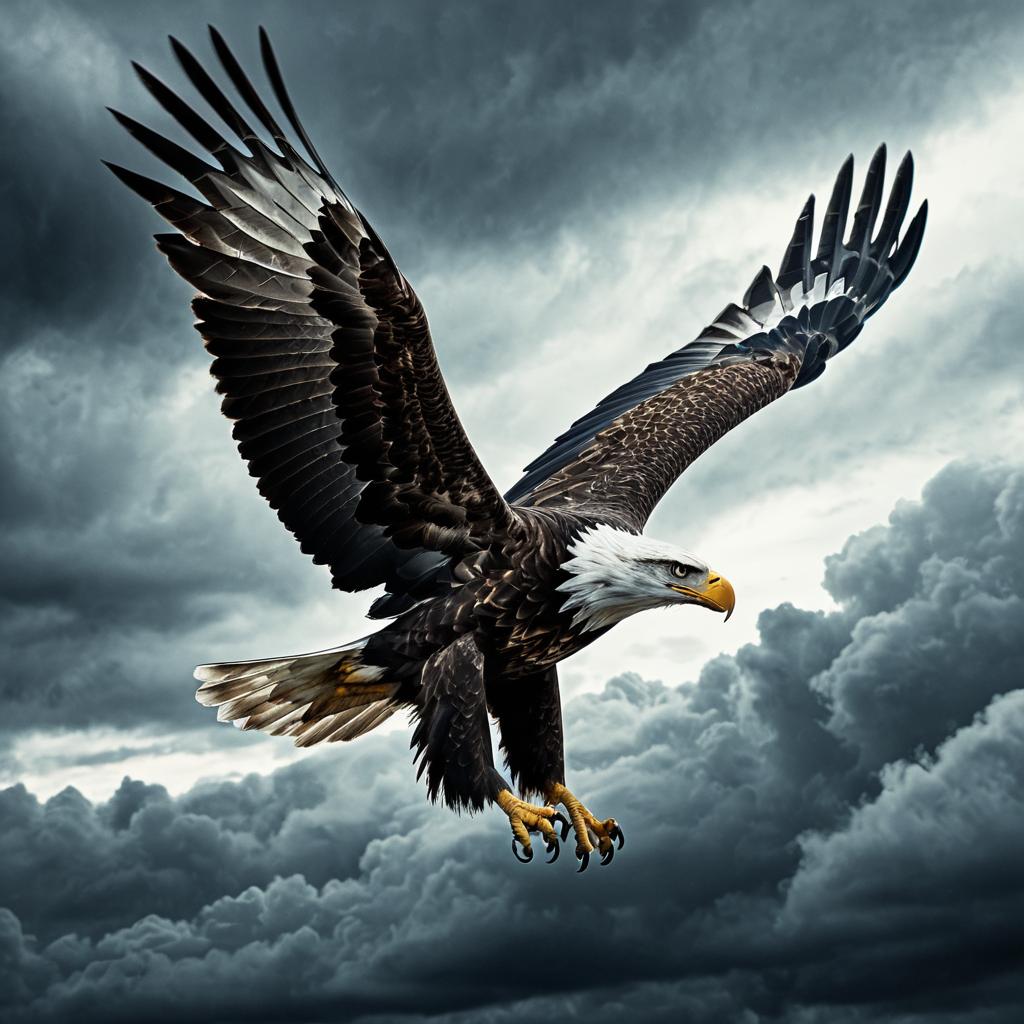 X-Ray artwork of an eagle soaring with wings spread, a cloudy moody sky backdrop, detailed skeletal structure with soft luminescent accents