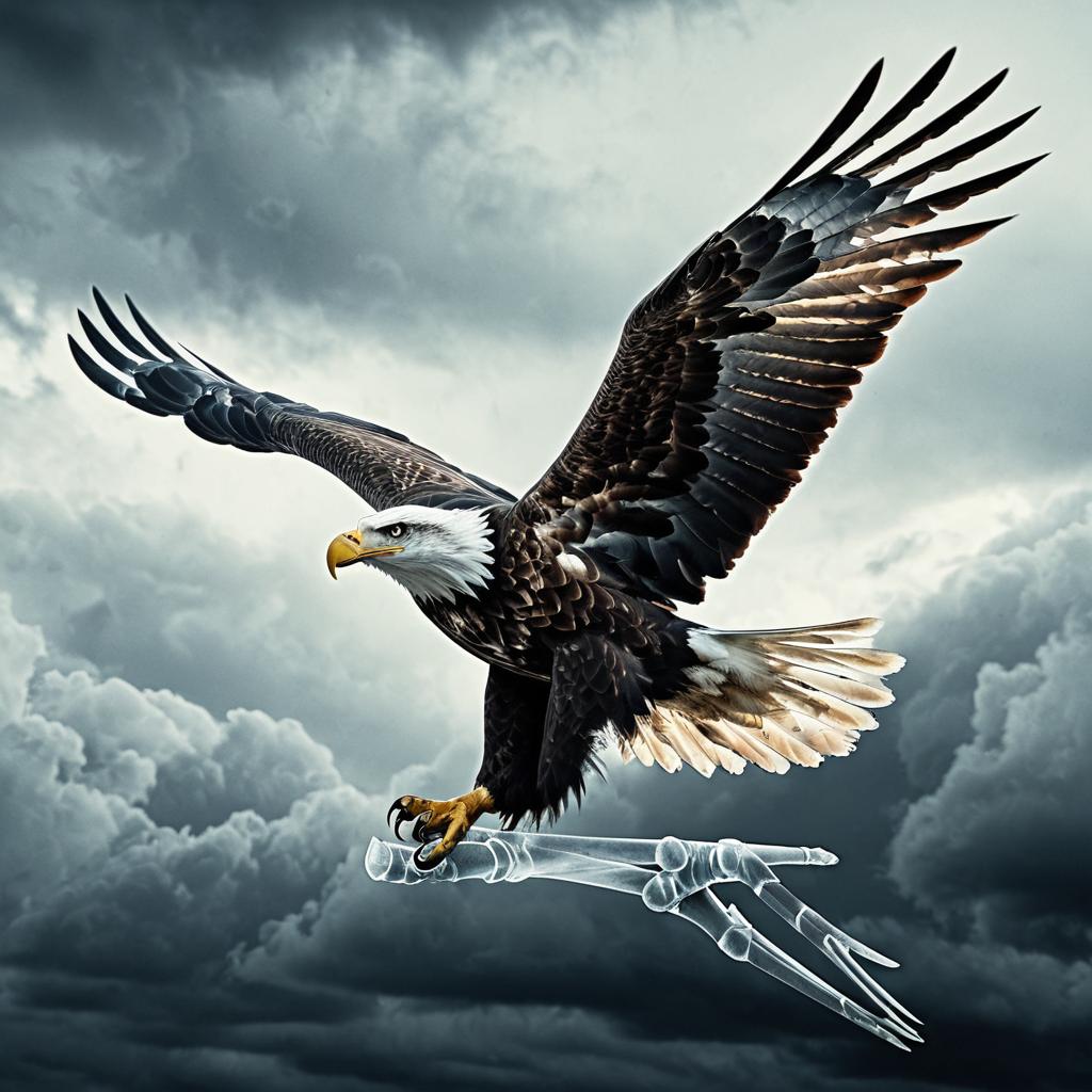 Digital artwork of a bald eagle soaring with wings fully spread against a moody cloudy sky. The eagle’s wings and talons are depicted with detailed x-ray skeletal structures featuring soft luminescent accents, blending realism and artistic x-ray effects.